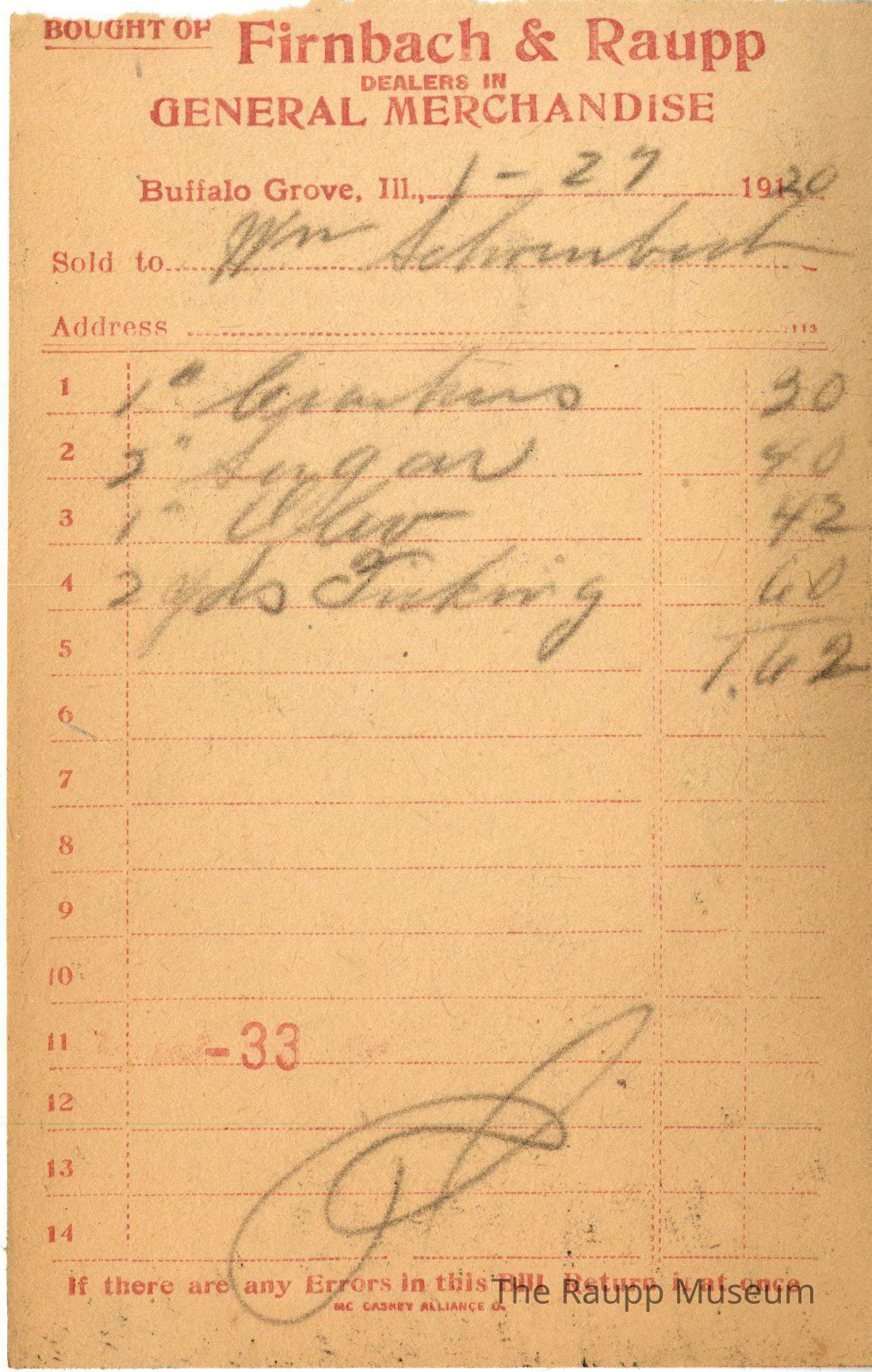 The red text is as follows, from top to bottom: "Bought of Firnbach and Raupp dealers in GENERAL MERCHANDISE" Buffalo Grove Ill.; Sold to; address; if there are any Errors in this Bill Return it at once; MC CASKEY ALLIANCE O."Archive Details