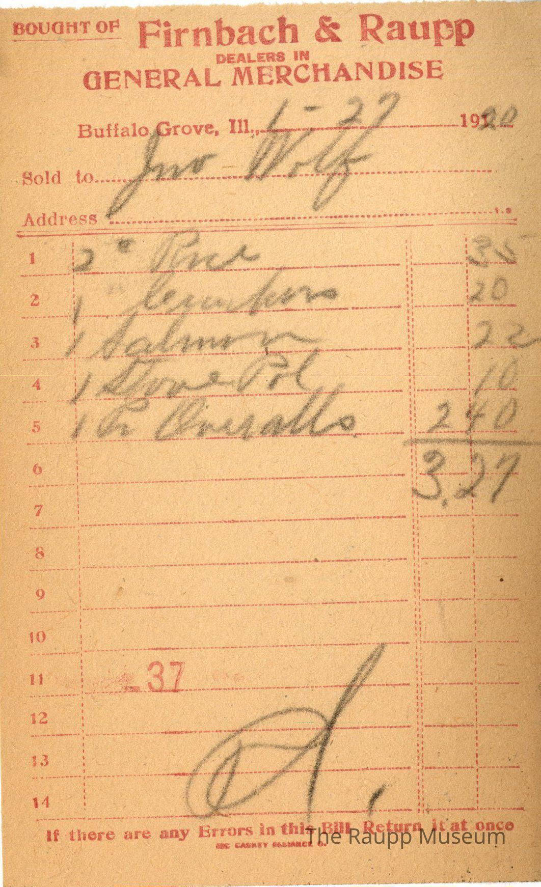 The red text is as follows, from top to bottom: "Bought of Firnbach and Raupp dealers in GENERAL MERCHANDISE" Buffalo Grove Ill.; Sold to; address; if there are any Errors in this Bill Return it at once; MC CASKEY ALLIANCE O."Archive Details