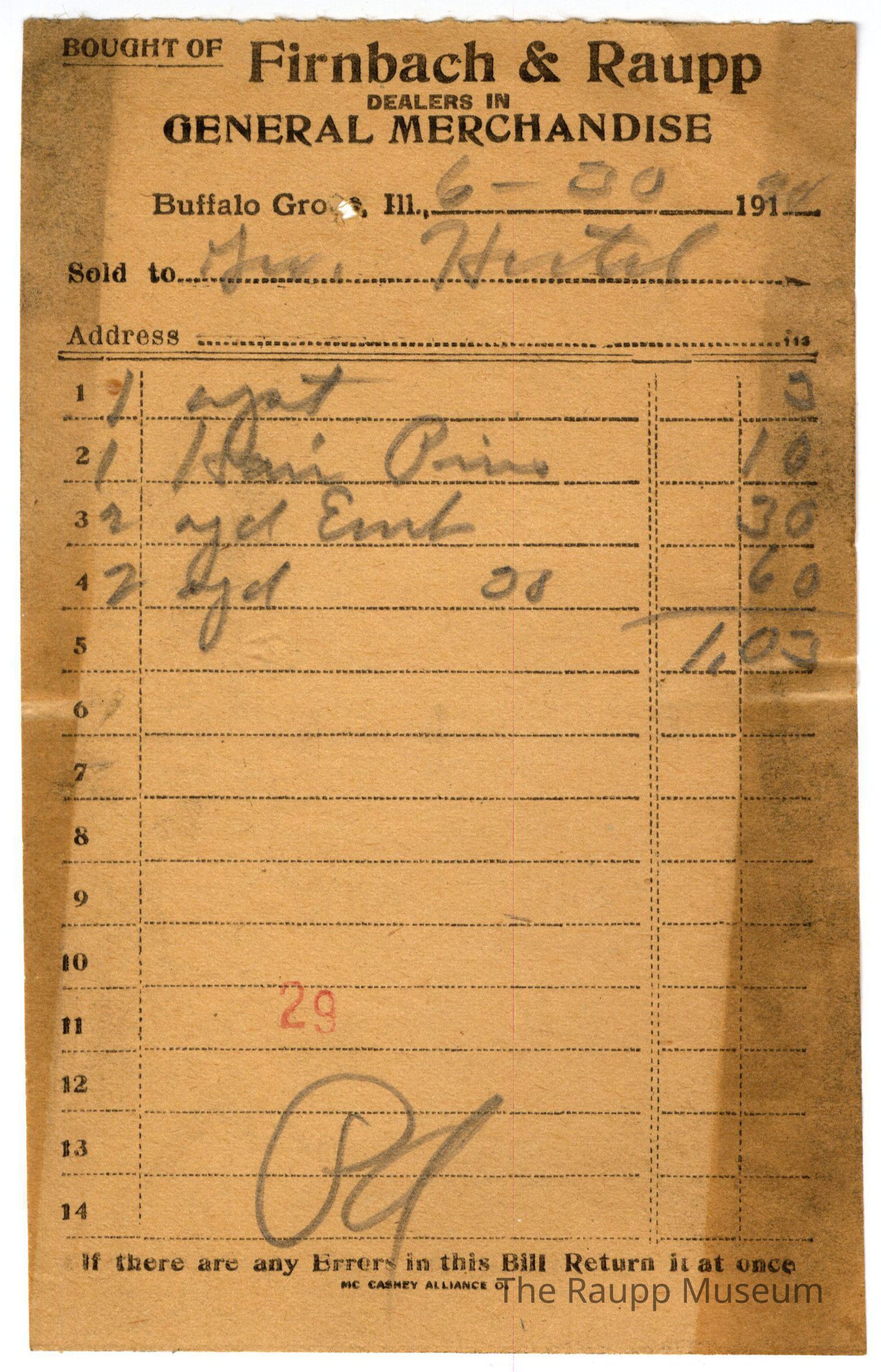 The black text is as follows, from top to bottom: Bought of Firnbach & Raupp, Dealers in GENERAL MERCHANDISE; Buffalo Grove Ill.; Sold to; Address; If there are any Errors in this Bill Return it at once; MC CASKEY ALLIANCE O.Archive Details