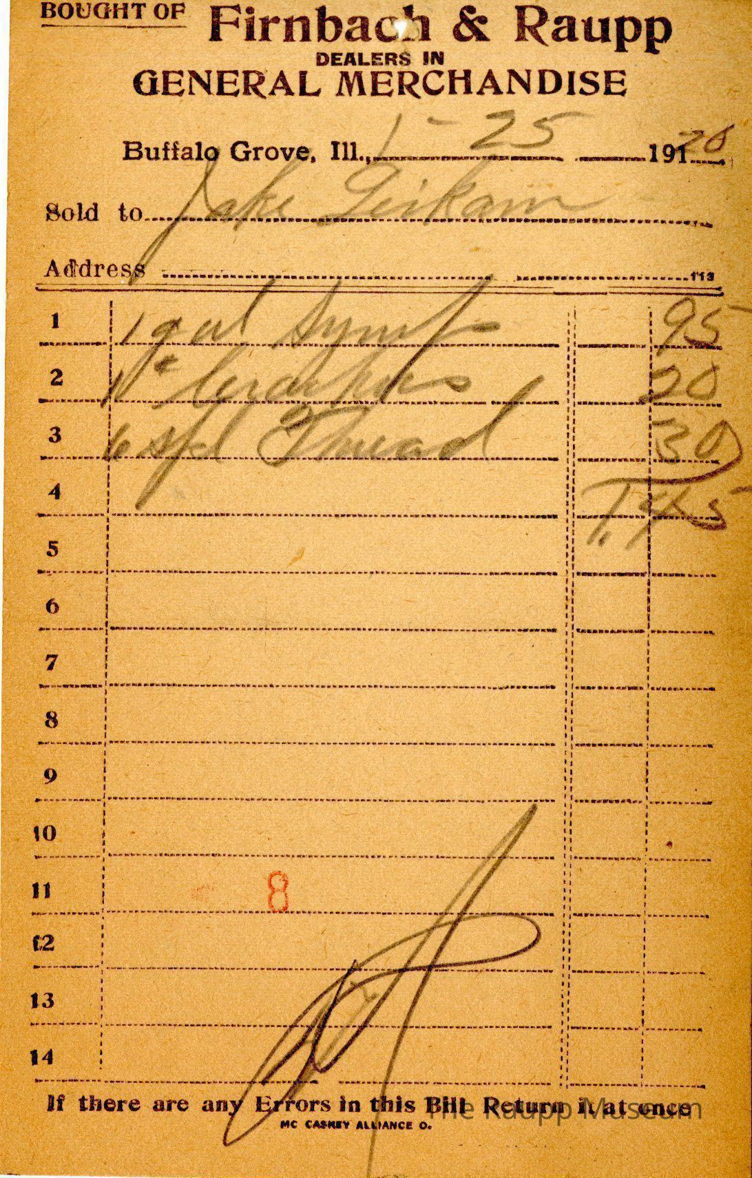 The black text is as follows, from top to bottom: "Bought of Firnbach and Raupp dealers in GENERAL MERCHANDISE" Buffalo Grove Ill.; Sold to; address; if there are any Errors in this Bill Return it at once; MC CASKEY ALLIANCE O."Archive Details