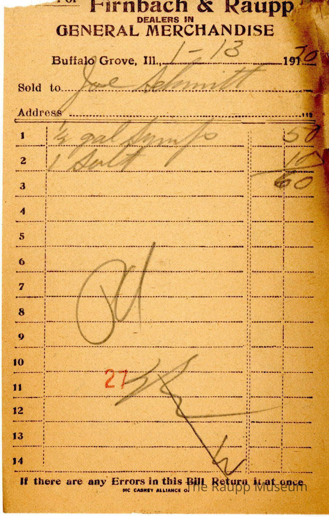 The black text is as follows, from top to bottom: "Bought of Firnbach and Raupp dealers in GENERAL MERCHANDISE" Buffalo Grove Ill.; Sold to; address; if there are any Errors in this Bill Return it at once; MC CASKEY ALLIANCE O."Archive Details