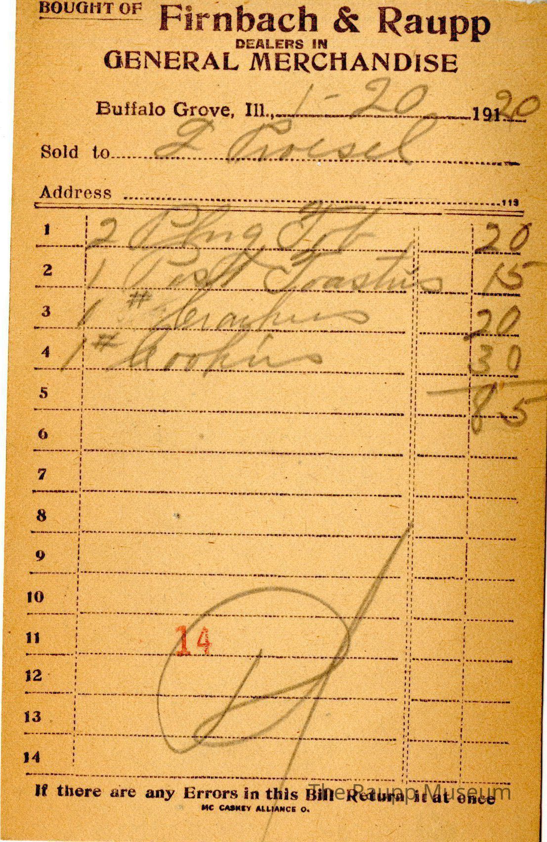 The black text is as follows, from top to bottom: "Bought of Firnbach and Raupp dealers in GENERAL MERCHANDISE" Buffalo Grove Ill.; Sold to; address; if there are any Errors in this Bill Return it at once; MC CASKEY ALLIANCE O."Archive Details