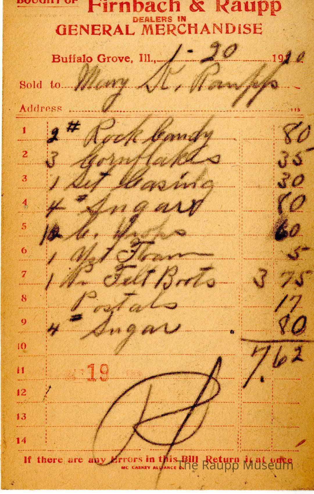 One (1) Firnbach and Raupp store receipt from January 20, 1920. Receipt is rectangular with red printed text and handwritten notes in pencil. The receipt is for Mary K. Raupp who purchased two pounds of rock candy for $0.80, three purchases of cornflakes for $0.35, one set casing for $0.30, four pounds of sugar for $0.80, ten purchases of drops for $0.60, one yeast foam for $0.05, one pair of felt boots for $3.75, postals for $0.17, and four more pounds of sugar for $0.80. The bill total comes out to $7.62. On the eleventh line there is a red stamped 19 and below it the bill is marked as paid.