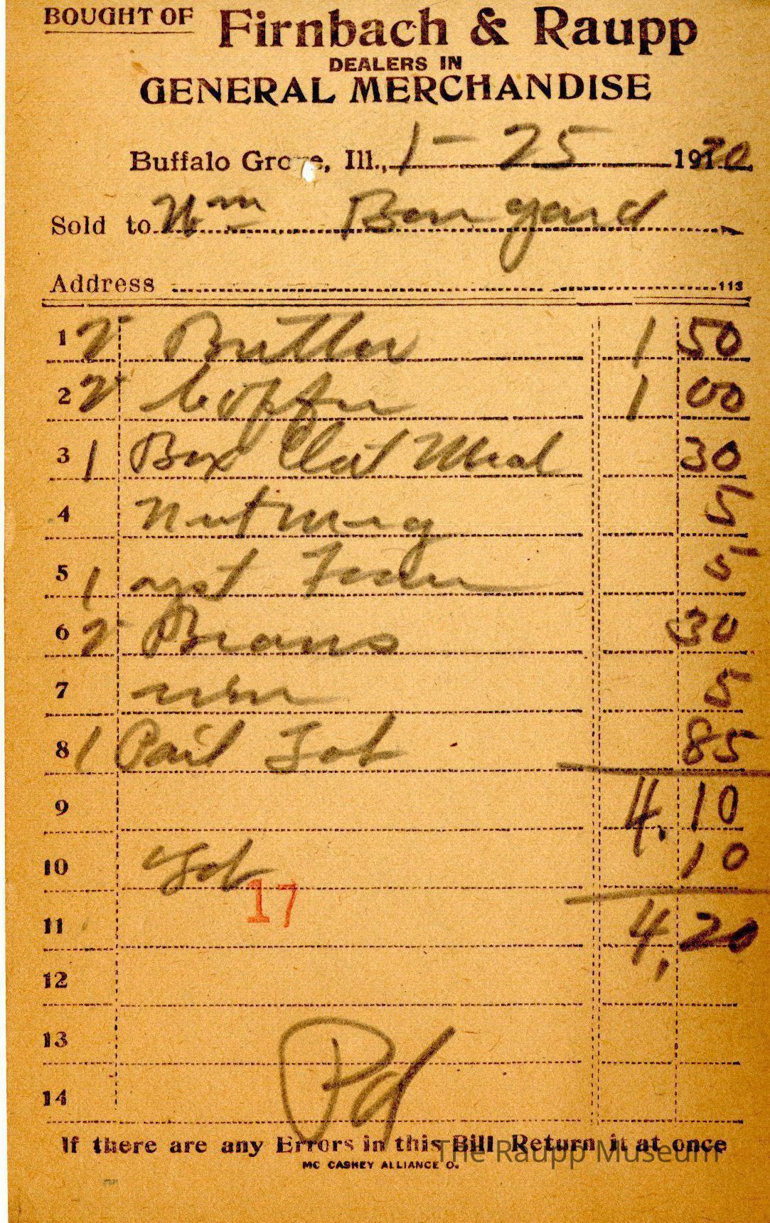 The black text is as follows, from top to bottom: "Bought of Firnbach and Raupp dealers in GENERAL MERCHANDISE" Buffalo Grove Ill.; Sold to; address; if there are any Errors in this Bill Return it at once; MC CASKEY ALLIANCE O."Archive Details