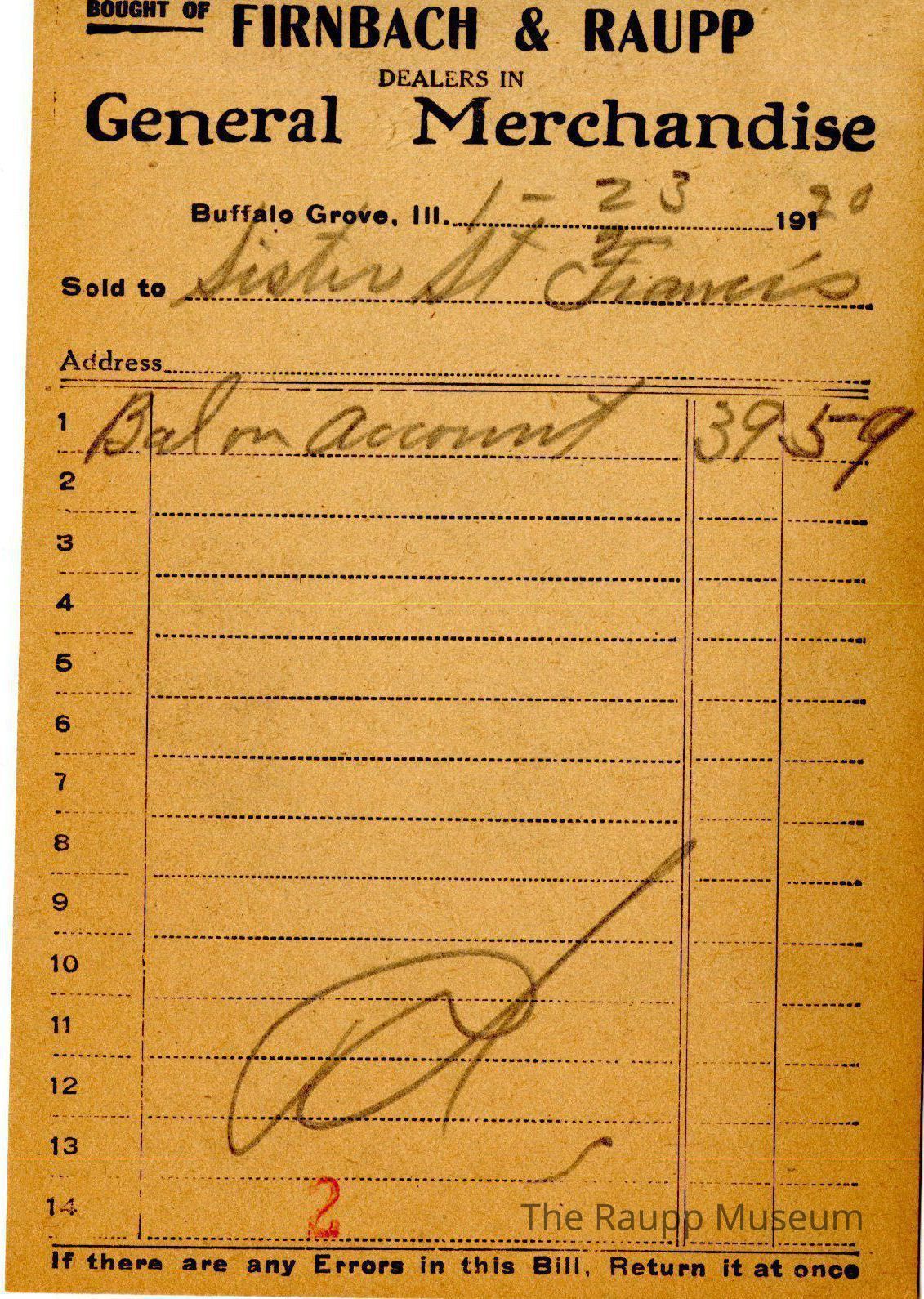 One (1) Firnbach and Raupp store receipt from January 23, 1920. Receipt is rectangular with black printed text and handwritten notes in pencil. The receipt is for Sister St. Francis. On the first line there is an account balance of $39.59 which is marked as paid on line 12, there is a red stamped two on line fourteen.