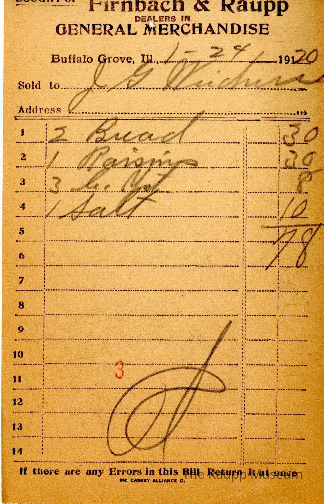 The black text is as follows, from top to bottom: "Bought of Firnbach and Raupp dealers in GENERAL MERCHANDISE" Buffalo Grove Ill.; Sold to; address; if there are any Errors in this Bill Return it at once; MC CASKEY ALLIANCE O."Archive Details