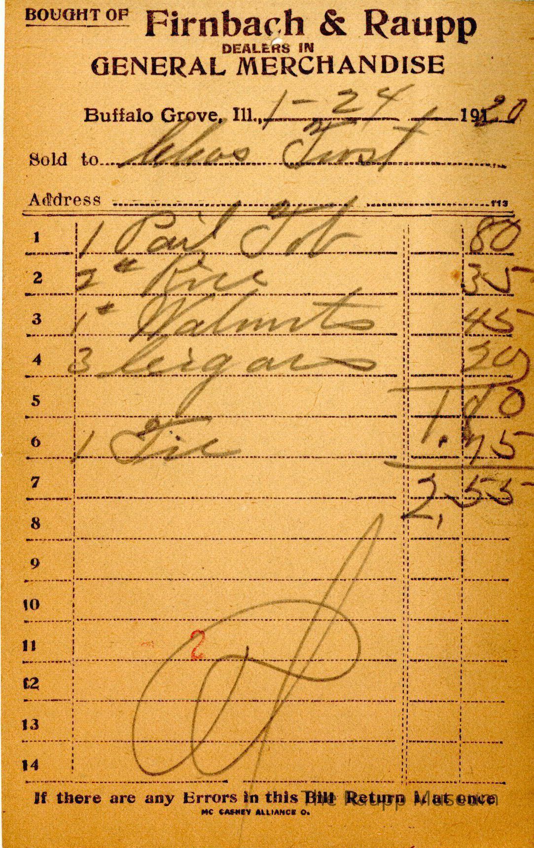 One (1) Firnbach and Raupp store receipt from January 24, 1920. Receipt is rectangular with black printed text and handwritten notes in pencil. The receipt is for Chas (Charles) Furst who purchased one paid tab for $0.80, two pounds of rice for $0.35, one pound of walnuts for $0.45, three cigars for $0.20 and one tie (?) for $0.75. The bill total comes out to $2.55. On the eleventh line there is a red stamped 2 and beside it the bill is marked as paid.