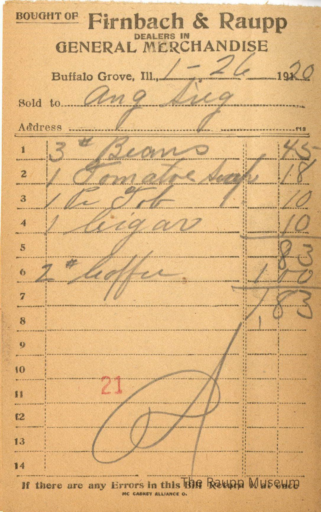 One (1) Firnbach and Raupp store receipt from January 26, 1920. Receipt is rectangular with black printed text and handwritten notes in pencil. The receipt is for Aug Sieg who purchased three beams for $0.45, one tomato soup for $0.18, one paid tab for $0.10, one cigar for $0.10 and two pounds of coffee for $1.00. The bill total comes out to $1.83 and the bill is marked as paid below. On the eleventh line there is a red stamp of 21.