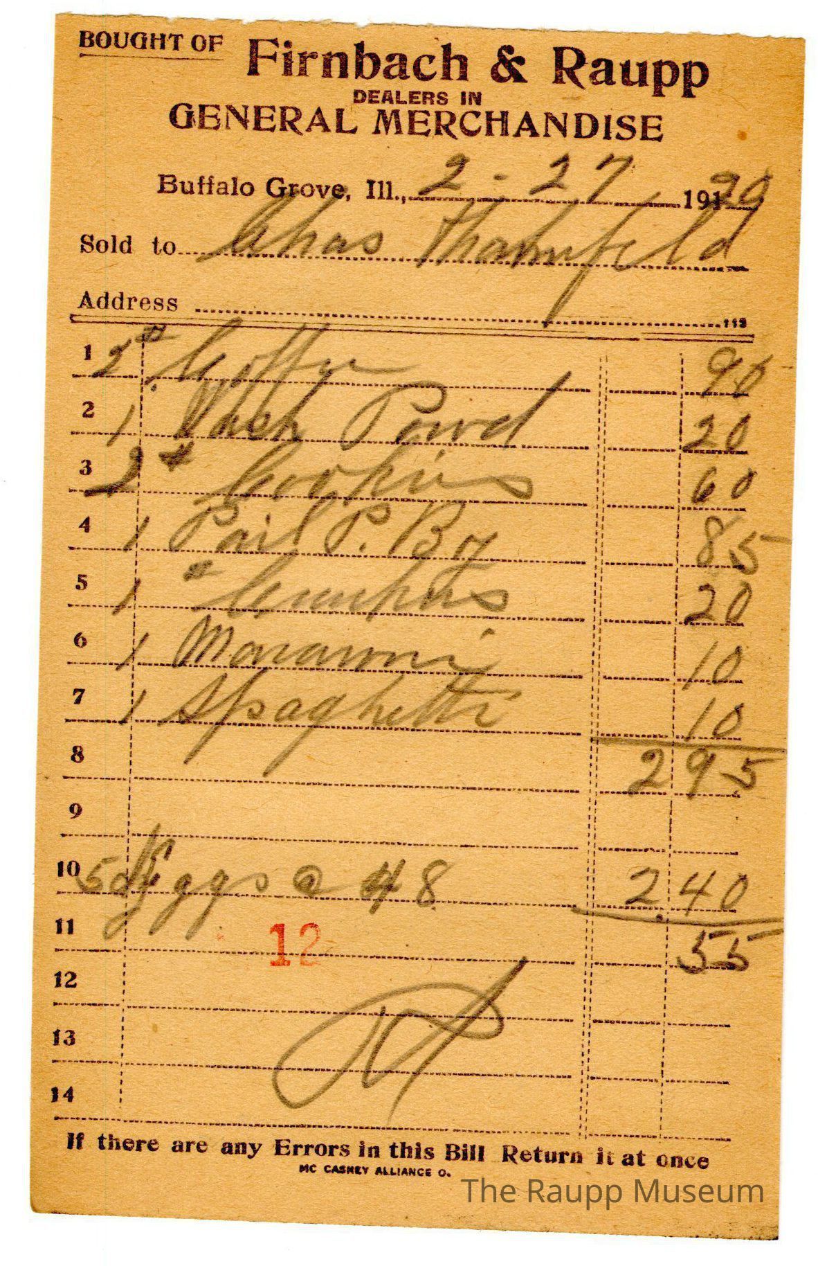 One (1) Firnbach and Raupp store receipt from February 27, 1920. Receipt is rectangular with black printed text and written notes in pencil. The receipt is for Chas Hansfeld(?), who bought two pounds coffee for $0.90, one wash powder for $0.20, two pounds cookies for $0.60, one Pail P. Boy for $0.85, one pound crackers for $0.20, one macaroni for $0.10, and one spaghetti for $0.10.The bill total was $2.95. There is a second bill for five dozen eggs at $0.48 each for $2.40. There is a red stamp of 12 close to the bottom, with the bill marked as paid.