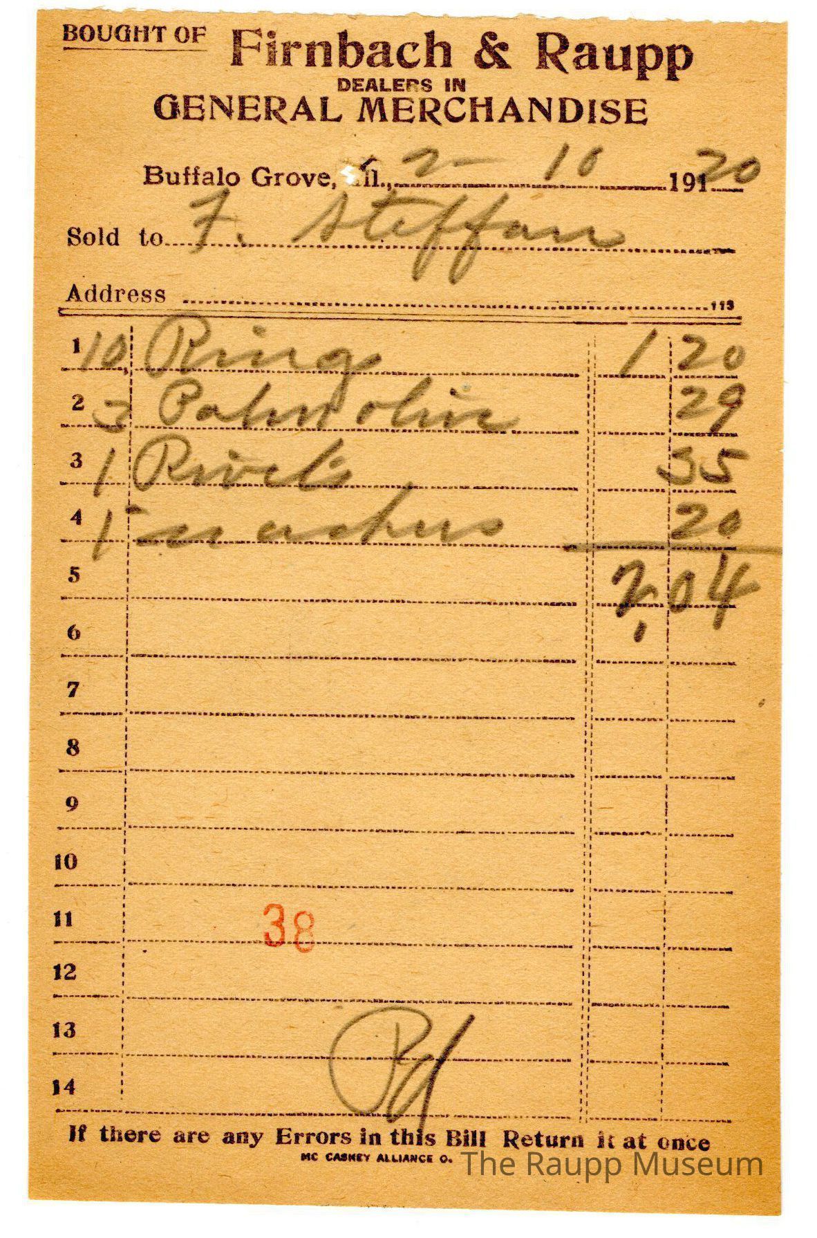 One (1) Firnbach and Raupp store receipt from February 10, 1920. Receipt is rectangular with black printed text and written notes in pencil. The receipt is for F. Steffan who bought ten ring for $1.20, three Palmolive for $0.29, one rivets (?) for $0.55, and one pound crackers for $0.20.The bill total was $2.04. There is a red stamp of 38 close to the bottom, with the bill marked as paid.