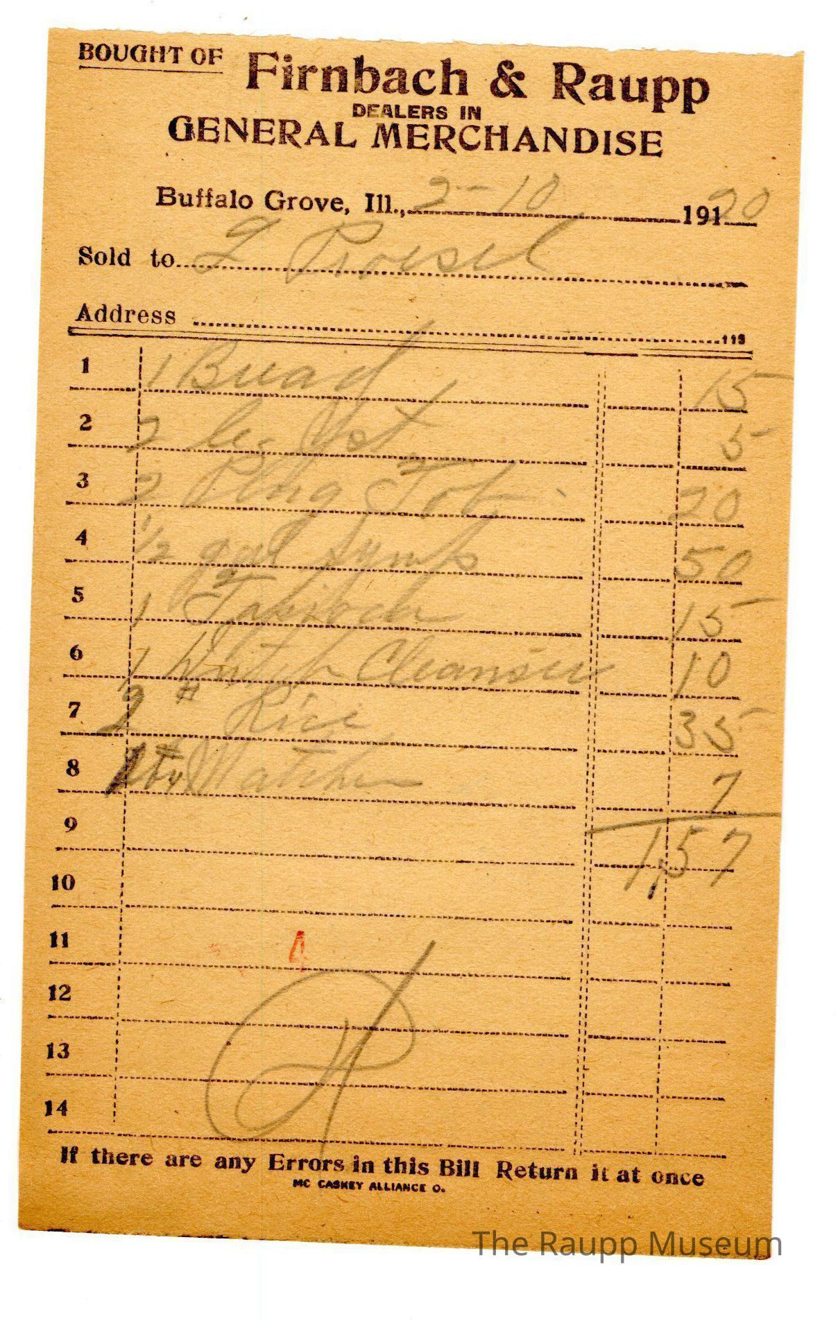 The black text is as follows, from top to bottom: "Bought of Firnbach and Raupp; Dealers in GENERAL MERCHANDISE; Buffalo Grove, Ill.; Sold to; Address; if there are any Errors in this Bill Return it at once; MC CASKEY ALLIANCE O."Archive Details