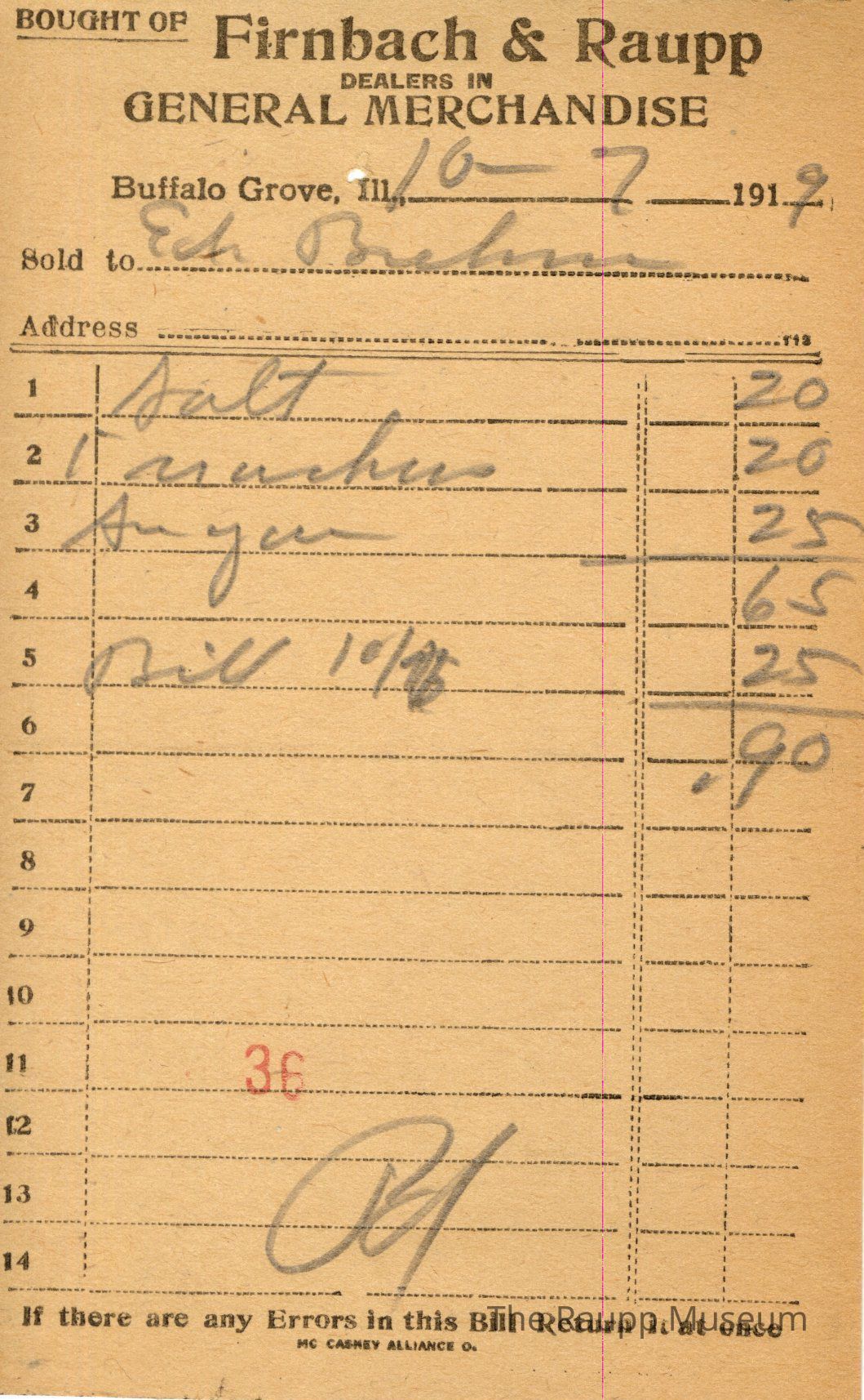 One (1) Firnbach and Raupp store receipt from October 7, 1919. Receipt is rectangular with black printed text and written notes in pencil. The receipt is for Ed Brehm, who bought salt for $0.20, one pound of crackers for $0.20, and sugar for $0.25. He also paid his outstanding bill from 10/5 (of $0.25). The bill total is $0.90 and the receipt is marked as paid. A red stamp of 36 is located towards the bottom of the page. The text from top to bottom is: BOUGHT OF Firnbach & Raupp; DEALERS IN GENERAL MERCHANDISE; Buffalo Grove, Ill.; Sold to; Address; If there are any Errors in this Bill Return It at once; MC CASKEY ALLIANCE O.Archive Details