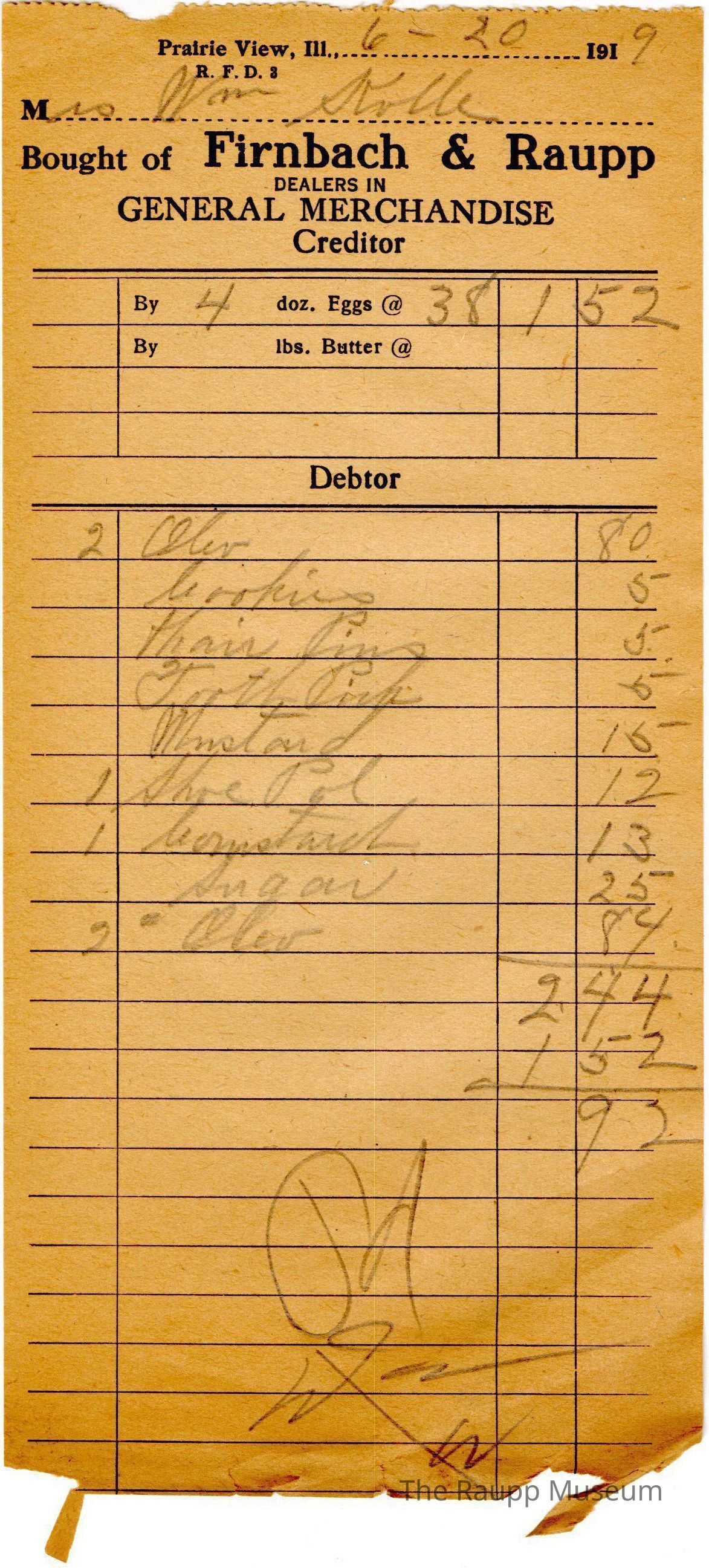 One (1) Firnbach and Raupp store receipt from June 20, 1919. Receipt is rectangular with black printed text and written notes in pencil. The receipt is for William Kolle, who brought 4 doz. eggs at $0.38 for $1.52. In addition, he bought two oleo for $0.80, cookies for $0.05, hair pins for $0.05, tooth pick for $0.05, mustard for $0.15, one shoe pol (polish) for $0.12, one cornstarch for $0.13, sugar for $0.25, and two oleo for $0.84. The debtor bill total is $2.44. The debtor bill total ($2.44) is subtracted by the creditor total ($1.52). The final debtor bill total is $0.92.
