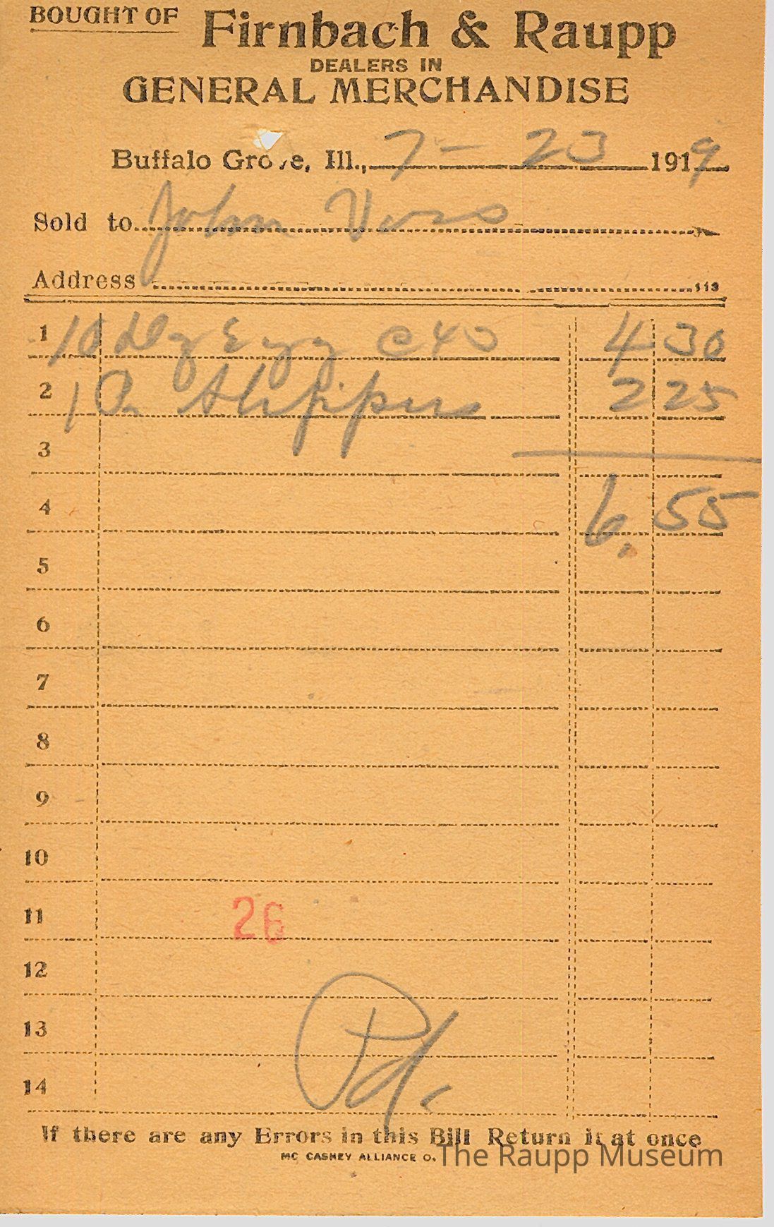 One (1) Firnbach and Raupp store receipt from July 23, 1919. Receipt is rectangular with black printed text and written notes in pencil.