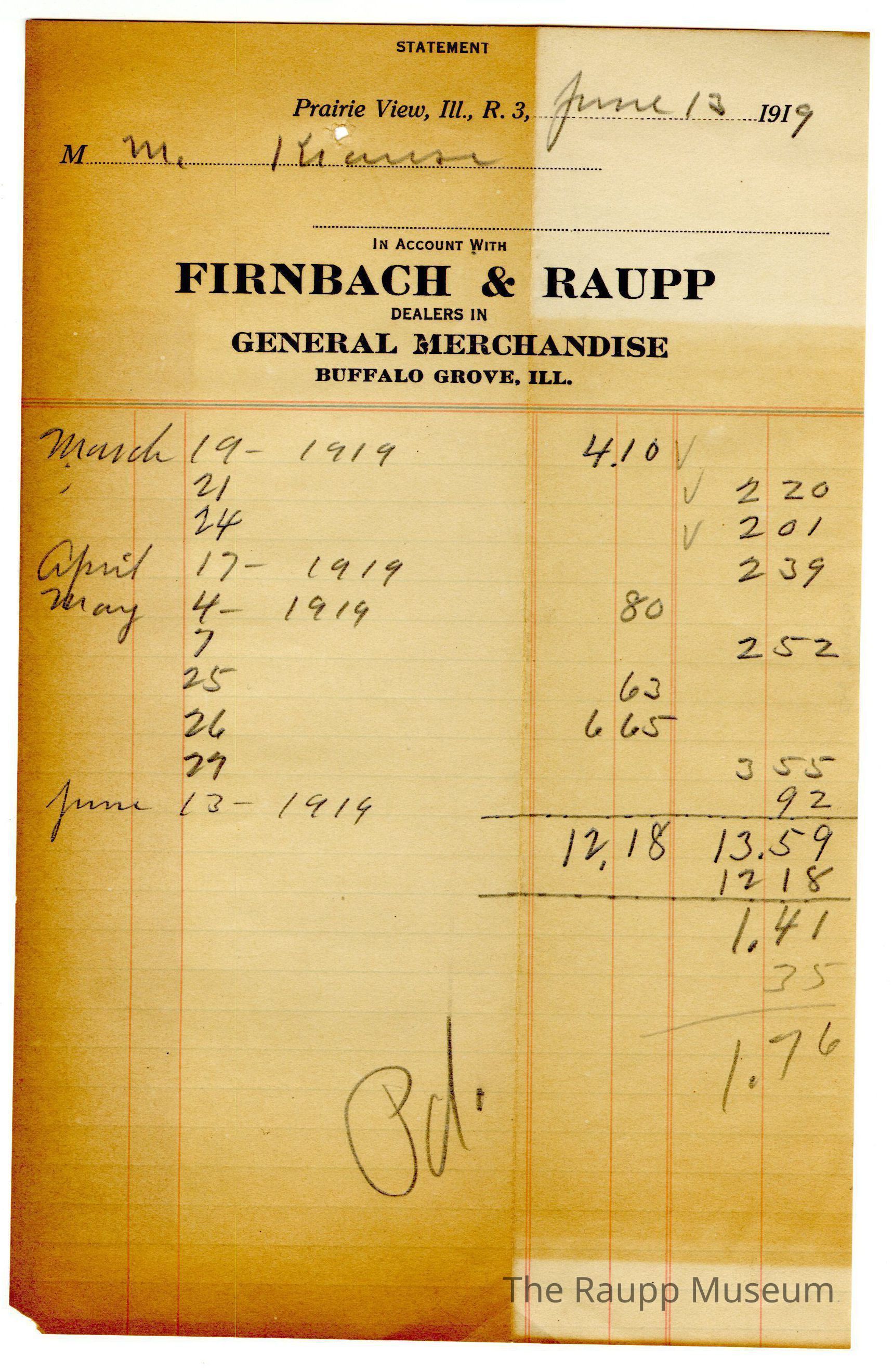 The black text is as follows, from top to bottom: STATEMENT; Prairie View, Ill., R. 3,; IN ACCOUNT WITH, FIRNBACH & RAUPP, DEALERS IN, GENERAL MERCHANDISE, BUFFALO GROVE, ILL.Archive Details