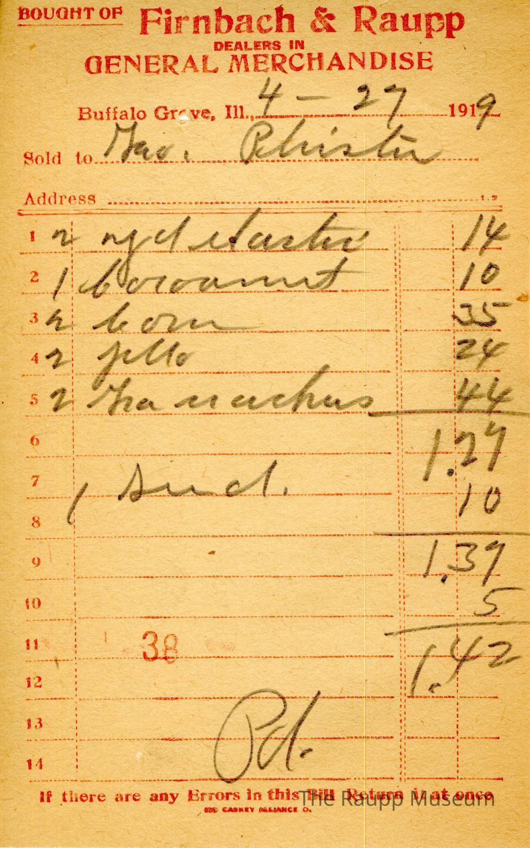 The red text is as follows, from top to bottom: Bought of Firnbach & Raupp; Dealers in GENERAL MERCHANDISE; Buffalo Grove, Ill.,; Sold to; Address; If there are any errors in this bill return it at once; MC Caskey Alliance Co.Archive Details