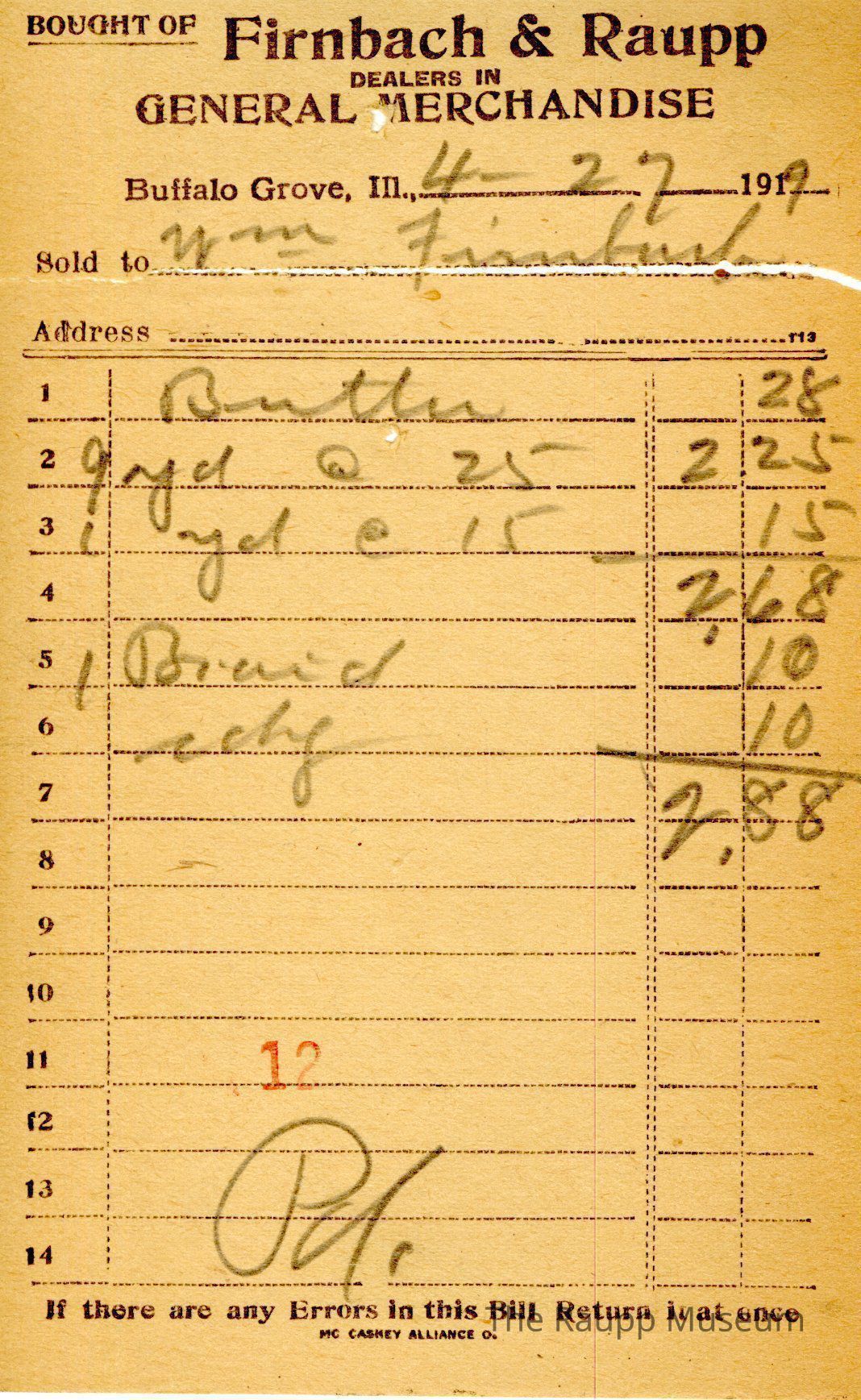 The black text is as follows, from top to bottom: Bought of Firnbach & Raupp; Dealers in GENERAL MERCHANDISE; Buffalo Grove, Ill.,; Sold to; Address; If there are any errors in this bill return it at once; MC Caskey Alliance Co.Archive Details