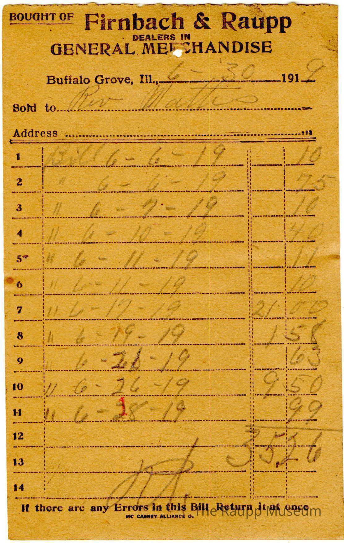 One (1) Firnbach and Raupp store receipt from June 30, 1919. Receipt is rectangular with black printed text and written notes in pencil. The receipt is for Rev Mattes, who paid Bill 6-6-19 for $0.10, " (continuation of bill) 6-6-19 for $0.75, " (continuation of bill) 6-7-19 for $0.10, " (continuation of bill) 6-10-19 for $0.40, " (continuation of bill) 6-11-19 for $0.11, " (continuation of bill) 6-11-19 for $0.10. " (continuation of bill) 6-17-19 for $21.00, " (continuation of bill) 6-19-19 for $1.58, " (continuation of bill) 6-21-19 for $0.63, " (continuation of bill) 6-26-19 for $9.50, and " (continuation of bill) 6-28-19 for $0.99. The bill total is $35.26.