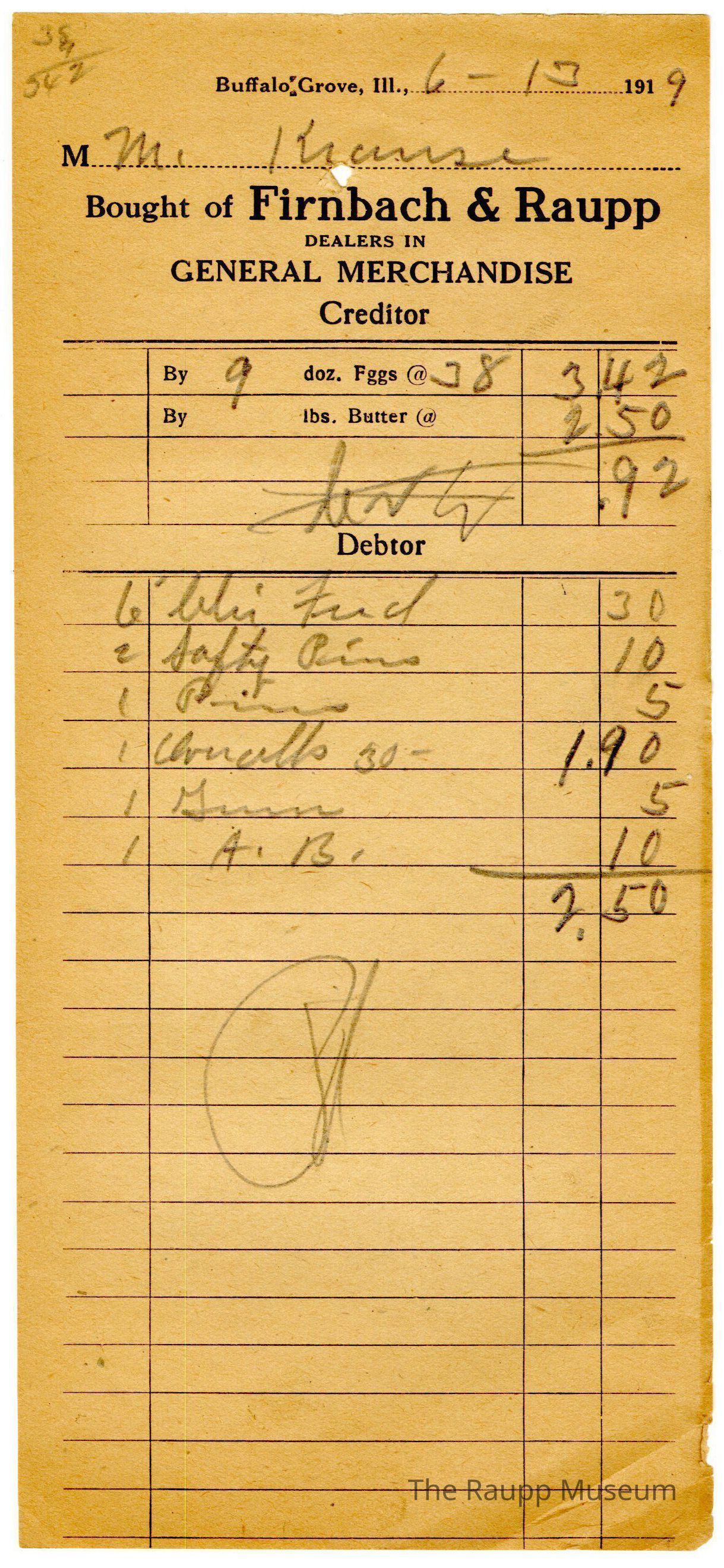 One (1) Firnbach and Raupp store receipt from June 13, 1919. Receipt is rectangular with black printed text and written notes in pencil. The receipt is for M. Knause, who bought six ' (pound) chi (chicken) feed for $0.30, two safety pins for $0.10, one pins for $0.05, one overalls 30- for $1.90, one gum (?) for $0.05, and one A. B. for $0.10. Bill total was $2.50. M. Knause brought in 9 dozen eggs at $0.38 per dozen to receive a total credit of $3.42, and after the $2.50 bill was subtract $0.92 remained. The bill is marked as paid (written as Pd.). There is as math equation in the upper left corner,