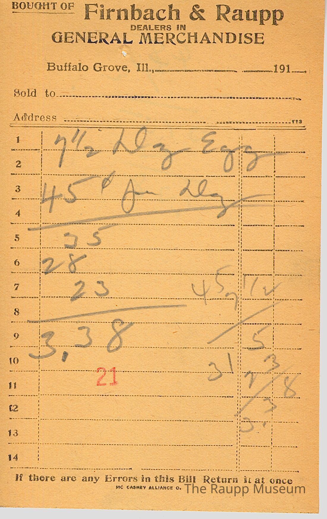 The black text is as follows, from top to bottom: Bought of Firnbach & Raupp; DEALERS IN; GENERAL MERCHANDISE; Buffalo Grove, Ill; Sold to; Address; If there are any Errors in this Bill, Return it at once; Mc Caskey Alliance CoArchive Details