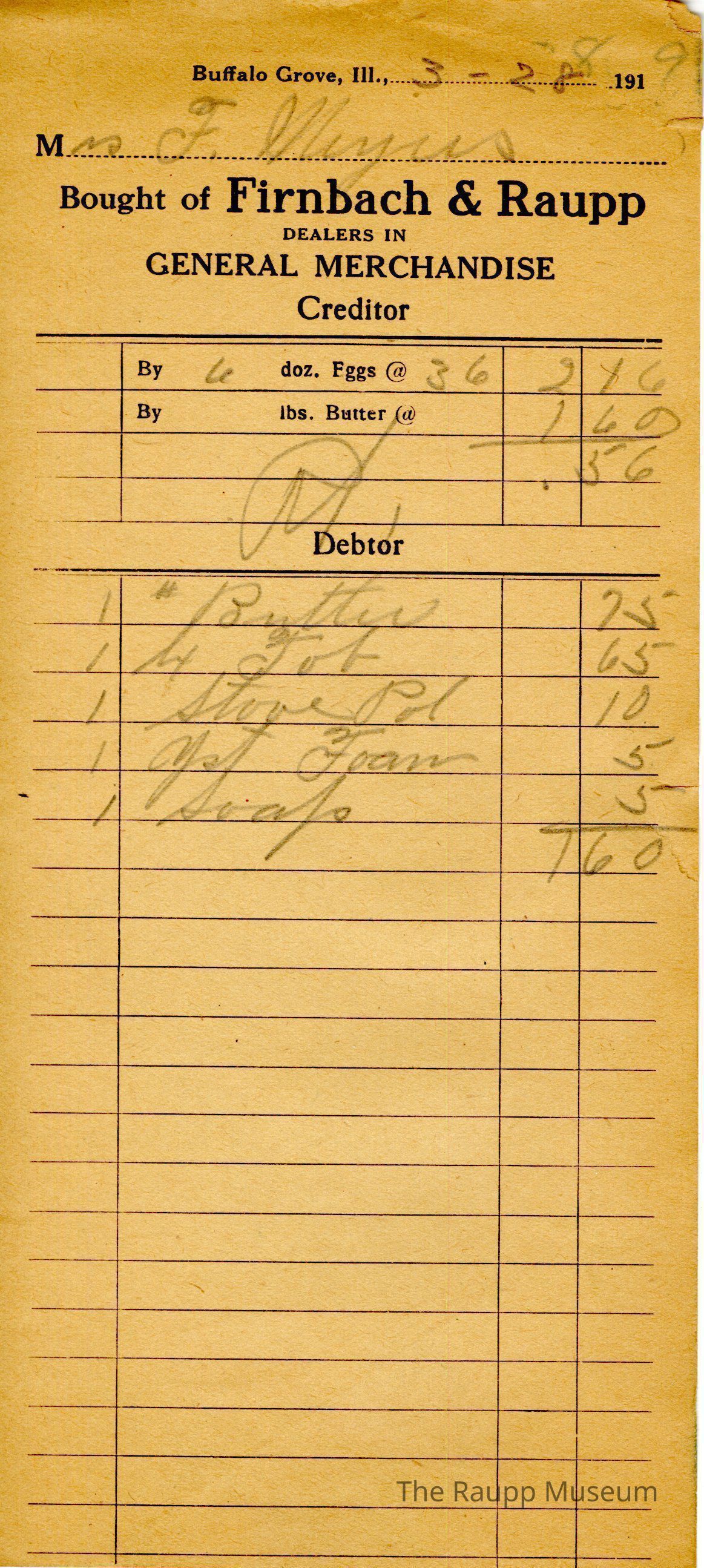 One (1) Firnbach & Raupp store receipt from March 28, 1919. The receipt is rectangular with black printed ink and handwritten notes in pencil. The receipt is for Mrs. F. Meyers, who brought 6 dozen eggs for $0.36 per dozen, totaling to $2.16. They also bought 1 pound of butter for $0.75, 1 (?) job (?) for $0.65, 1 stove polish for $0.10, yeast foam for $0.05, and soap for $0.05. The bill total is $1.60. There is a "Pd." to indicate that it was paid. They received $0.56 in return.