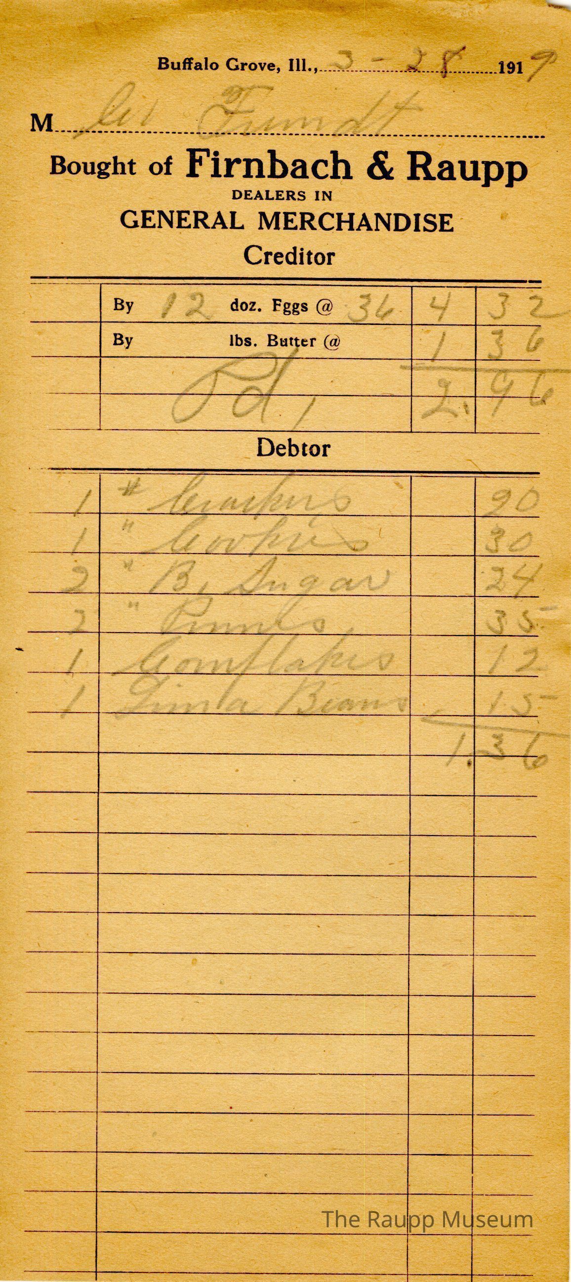 The black printed text is as follows, from top to bottom: Buffalo Gove. Ill, 191; Bought of Firnbach & Raupp; Dealers in GENERAL MERCHANDISE; Creditor; DebtorArchive Details