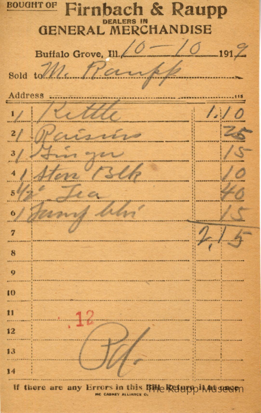 One (1) Firnbach and Raupp store receipt from October 10, 1919. Receipt is rectangular with black printed text and written notes in pencil. The receipt is for M. Raupp, who bought one kettle for $1.10, one raisins for $0.25, one ginger for $0.15, one stove block for $0.10, one-half pound of tea for $0.40, and one Jany Whi (?) for $0.15. The bill total is $2.15 and the receipt is marked as paid. A red stamp of 12 is located towards the bottom of the page. The text from top to bottom is: BOUGHT OF Firnbach & Raupp; DEALERS IN GENERAL MERCHANDISE; Buffalo Grove, Ill.; Sold to; Address; If there are any Errors in this Bill Return It at once; MC CASKEY ALLIANCE O.Archive Details