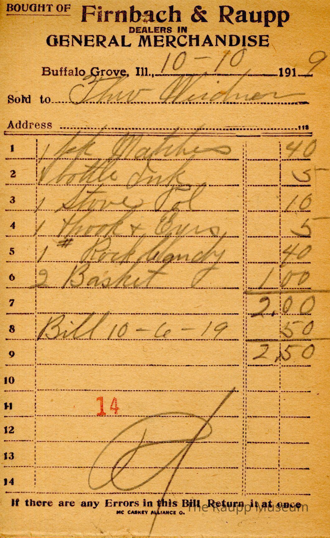 One (1) Firnbach and Raupp store receipt from October 10, 1919. Receipt is rectangular with black printed text and written notes in pencil. The receipt is for Theo Weidner, who bought one pack of matches for $0.40, one bottle of ink for $0.05, one stove polish for $0.10, one Hook and Eyes (?) for $0.05, one pound of rock candy for $0.40, and two baskets for $1.00. The customer also paid his outstanding bill from October 6th ($0.50) for a grand total of $2.50 and the receipt is marked as paid. A red stamp of 14 is located towards the bottom of the page. The text from top to bottom is: BOUGHT OF Firnbach & Raupp; DEALERS IN GENERAL MERCHANDISE; Buffalo Grove, Ill.; Sold to; Address; If there are any Errors in this Bill Return It at once; MC CASKEY ALLIANCE O.Archive Details