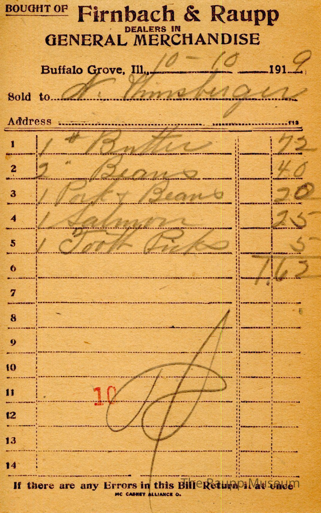 One (1) Firnbach and Raupp store receipt from October 10, 1919. Receipt is rectangular with black printed text and written notes in pencil. The receipt is for N. Hinsberger, who bought one pound of butter for $0.72, two pounds of beans for $0.40, one pork and beans for $0.20, one salmon for $0.25, and one toothpicks for $0.05. The total is $1.62 and the receipt is marked as paid. A red stamp of 10 is located towards the bottom of the page. The text from top to bottom is: BOUGHT OF Firnbach & Raupp; DEALERS IN GENERAL MERCHANDISE; Buffalo Grove, Ill.; Sold to; Address; If there are any Errors in this Bill Return It at once; MC CASKEY ALLIANCE O.Archive Details