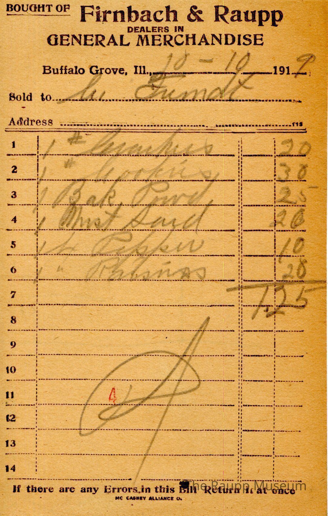 One (1) Firnbach and Raupp store receipt from October 10, 1919. Receipt is rectangular with black printed text and written notes in pencil. The receipt is for H. Fremdt (?), who bought one pound of crackers for $0.20, one pound of cookies for $0.30, one baking powder for $0.25, one Must Sard for $0.20, one box of peppers for $0.10, and one box of raisins for $0.20. The total is $1.25 and the receipt is marked as paid. A red stamp of 4 is located towards the bottom of the page. The text from top to bottom is: BOUGHT OF Firnbach & Raupp; DEALERS IN GENERAL MERCHANDISE; Buffalo Grove, Ill.; Sold to; Address; If there are any Errors in this Bill Return It at once; MC CASKEY ALLIANCE O.Archive Details