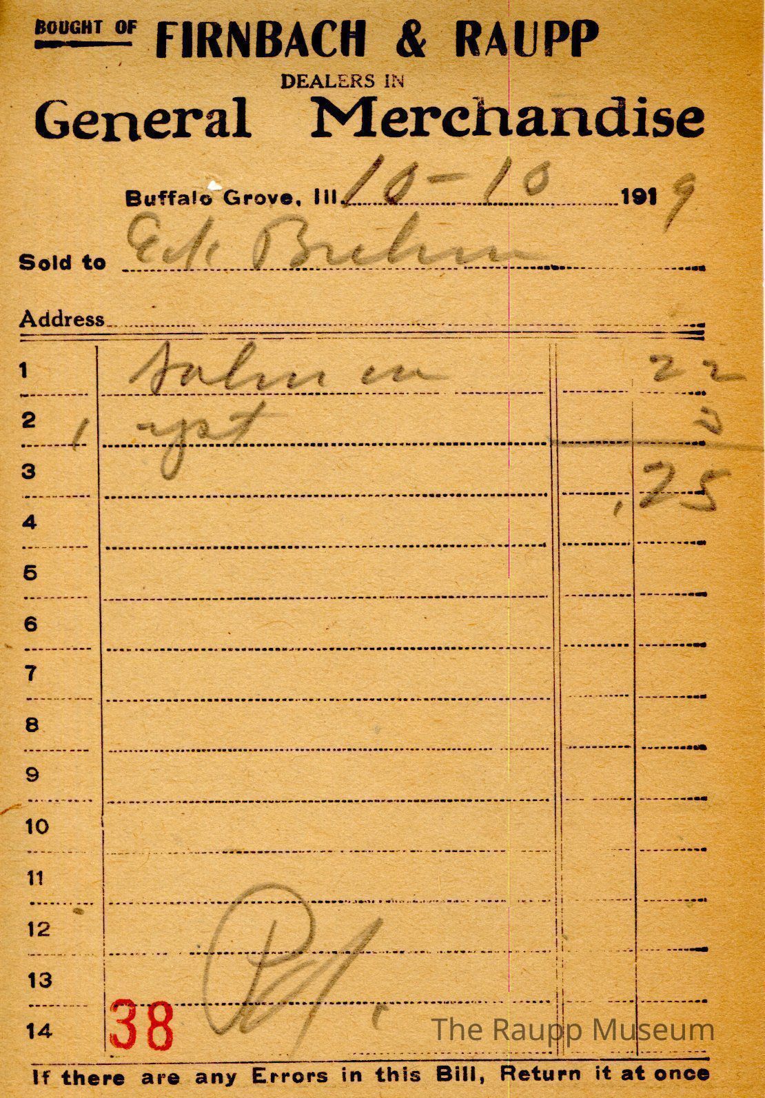 One (1) Firnbach and Raupp store receipt from October 10, 1919. Receipt is rectangular with black printed text and written notes in pencil. The receipt is for Ed Brehm, who bought salmon for $0.22 and one yeast for $0.03. The total is $0.25 and the receipt is marked as paid. A red stamp of 38 is located towards the bottom of the page. The text from top to bottom is: BOUGHT OF FIRNBACH & RAUPP; DEALERS IN General Merchandise; Buffalo Grove, Ill.; Sold to; Address; If there are any Errors in this Bill Return it at onceArchive Details
