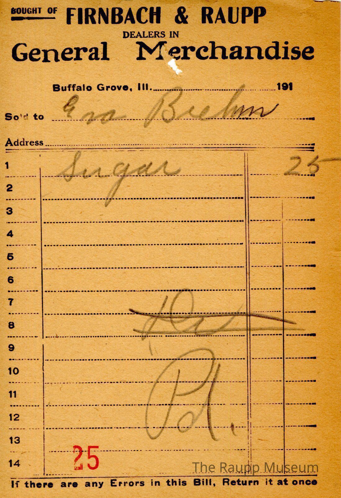 One (1) Firnbach and Raupp store receipt from circa 1919. Receipt is rectangular with black printed text and written notes in pencil. The receipt is for Eva Brehm, who bought sugar for $0.25. The total is $0.25 and the receipt is marked as paid. A red stamp of 25 is located towards the bottom of the page. The text from top to bottom is: BOUGHT OF FIRNBACH & RAUPP; DEALERS IN General Merchandise; Buffalo Grove, Ill.; Sold to; Address; If there are any Errors in this Bill Return it at onceArchive Details