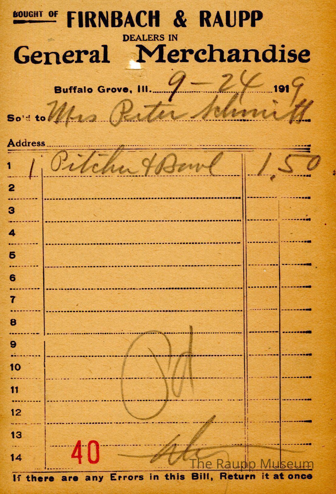 One (1) Firnbach and Raupp store receipt from September 24, 1919. Receipt is rectangular with black printed text and written notes in pencil. The receipt is for Mrs. Peter Schmitt, who bought one pitcher and bowl for $1.50. The total is $1.50 and the receipt is marked as paid. A red stamp of 40 is located towards the bottom of the page. The text from top to bottom is: BOUGHT OF FIRNBACH & RAUPP; DEALERS IN General Merchandise; Buffalo Grove, Ill.; Sold to; Address; If there are any Errors in this Bill Return it at onceArchive Details