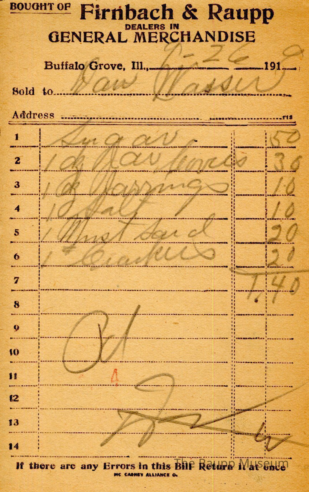 One (1) Firnbach and Raupp store receipt from September 26, 1919. Receipt is rectangular with black printed text and written notes in pencil. The receipt is for Dan Wasser, who bought sugar for $0.50, one dozen of jar bovees (?) for $0.30, one dozen of jarrings for $0.20, one salt for $0.10, one Must Sard for $0.20, and one pound of crackers for $0.20. The total is $1.40 and the receipt is marked as paid. A red stamp of 4 is located towards the bottom of the page. The text from top to bottom is: BOUGHT OF Firnbach & Raupp; DEALERS IN GENERAL MERCHANDISE; Buffalo Grove, Ill.; Sold to; Address; If there are any Errors in this Bill Return It at once; MC CASKEY ALLIANCE O.Archive Details