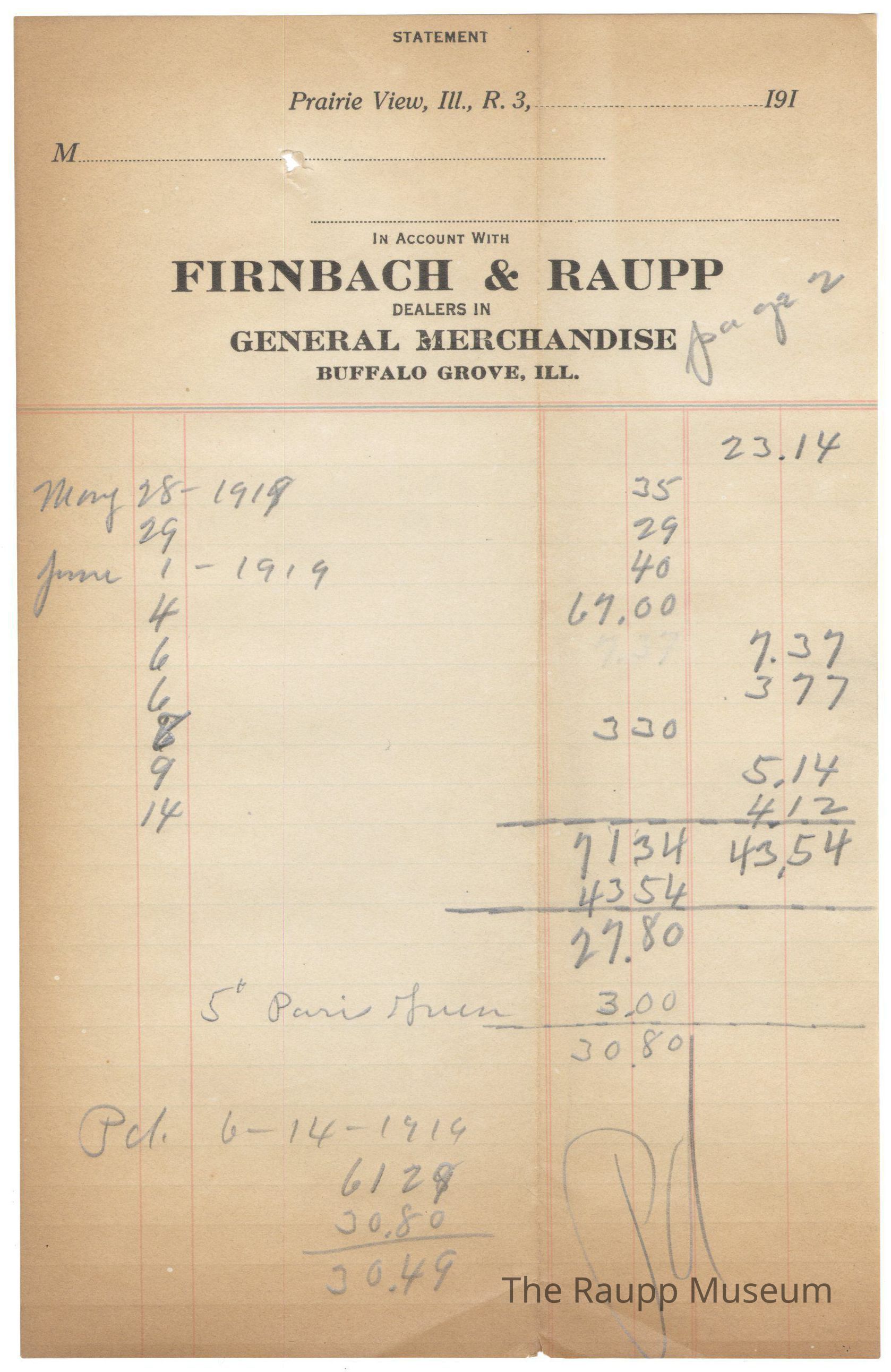 The black text is as follows, from top to bottom: STATEMENT; Prairie View, Ill., R. 3,; IN ACCOUNT WITH, FIRNBACH & RAUPP, DEALERS IN, GENERAL MERCHANDISE, BUFFALO GROVE, ILL.Archive Details