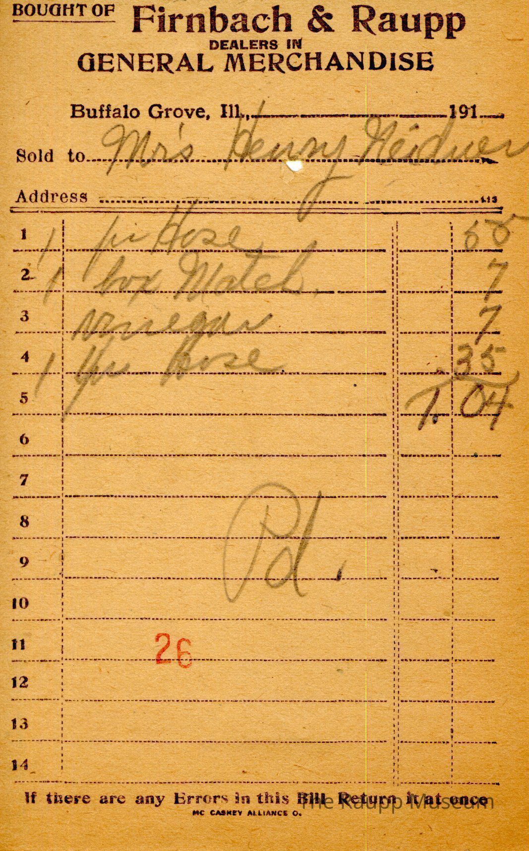 One (1) Firnbach and Raupp store receipt from circa 1919. Receipt is rectangular with black printed text and written notes in pencil. The receipt is for Mrs. Henry Weidner, who bought sugar for $0.50, one pi hose (?) for $0.55, one box of matches for $0.07, vinegar (?) for $0.07, and one yr hose (?) for $0.35. The total is $1.04 and the receipt is marked as paid. A red stamp of 26 is located towards the bottom of the page. The text from top to bottom is: BOUGHT OF Firnbach & Raupp; DEALERS IN GENERAL MERCHANDISE; Buffalo Grove, Ill.; Sold to; Address; If there are any Errors in this Bill Return It at once; MC CASKEY ALLIANCE O.Archive Details