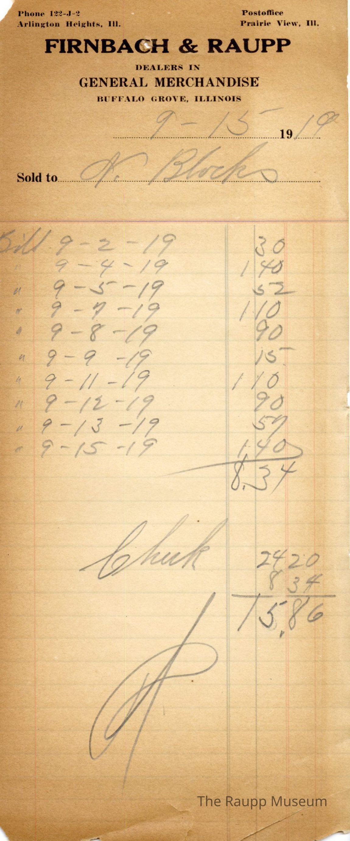 One (1) Firnbach and Raupp store receipt from September 15, 1919. Receipt is rectangular with black printed text and written notes in pencil. The receipt is for N. Block, listing all the that was accumulated since September 2nd of that year and the amount of money that is owed on credit. The written information is, from top to bottom: September 2nd - $0.30, 4th - $1.40, 5th - $0.52, 7th - $1.10, 8th - $0.90, 9th - $0.15, 11th - $1.10, 12th - $0.90. 13th - $0.59, 15th - $1.40. The total sum is $8.34. It was also marked on the receipt that there was a check of $24.20 made and the total was subtracted likely to determine what the amount to be payed to Block is, which was $15.86. The receipt was marked as paid. The black text is as follows, from top to bottom: Phone 122-J-2; Arlington Heights, Ill.; Postoffice Prairie View, Ill.; FIRNBACH & RAUPP; DEALERS IN GENERAL MERCHANDISE; BUFFALO GROVE, ILLINOIS; Sold toArchive Details