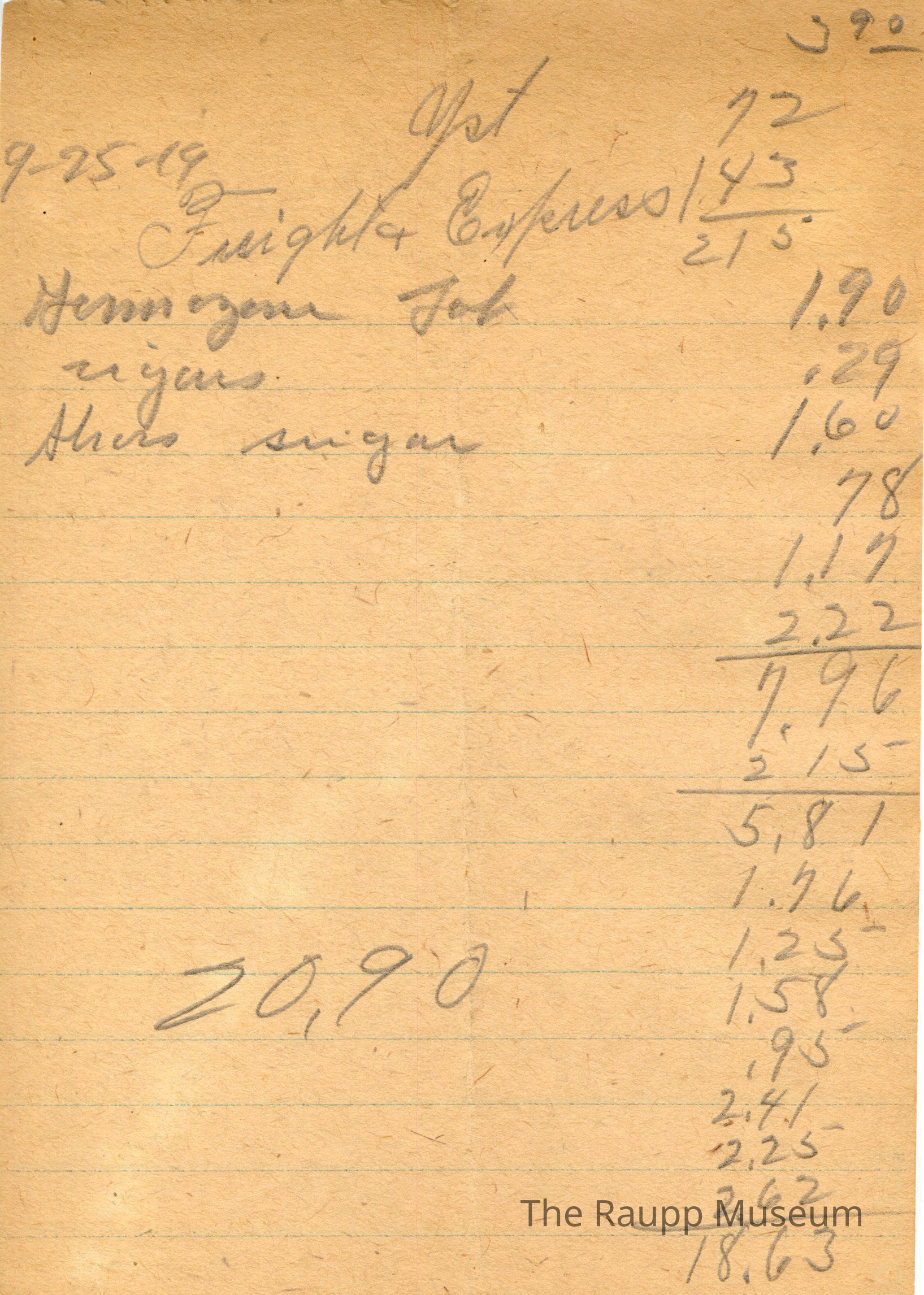 One (1) Firnbach and Raupp store receipt from September 25, 1919. Receipt is rectangular with no printed text and written notes in pencil. The receipt is for an unknown customer, who bought yeast (yst) for $0.72, freight and express for $1.43, Germegena (?) Tub for $1.90, cigars for $0.29, and shoes sugar for $1.60. Other prices of $3.90, $2.15, $0.78, $1.19, $2.22, $5.81, $1.76, $1.25, $1.58, $0.95, $2.41, $2.25, and $2.62 are also marked. Upon substracting $2.15, the bill total appears to be $18.63. There's another mark of 20.90 to the left of the calculations.Archive Details
