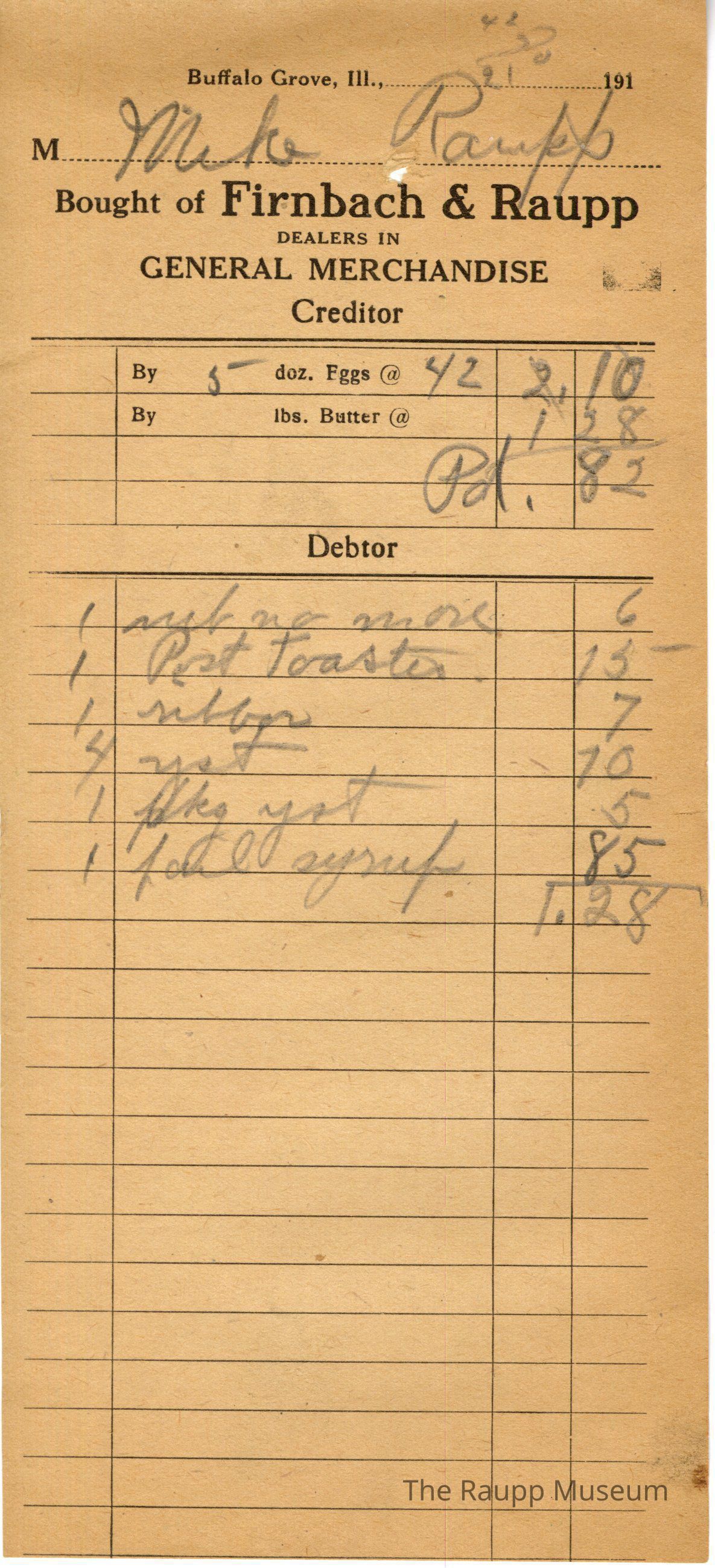 One (1) Firnbach and Raupp store receipt from circa 1919. Receipt is rectangular with black printed text and written notes in pencil. The receipt is for Mike Raupp, who sold 5 dozen eggs @ $0.42 for a total of $2.10. He bought 1 rub no more for $0.06, 1 Post Toasties for $0.15,1 ribbon for $0.07, 4 yst (yeast) for $0.10, 1 pkg yst for $0.05 and 1 (?) syrup for $0.85. The spending total was $1.28. After subtracting the spending total from the money earned from the eggs, the bill total was $0.82 earned. The bill is marked as paid.