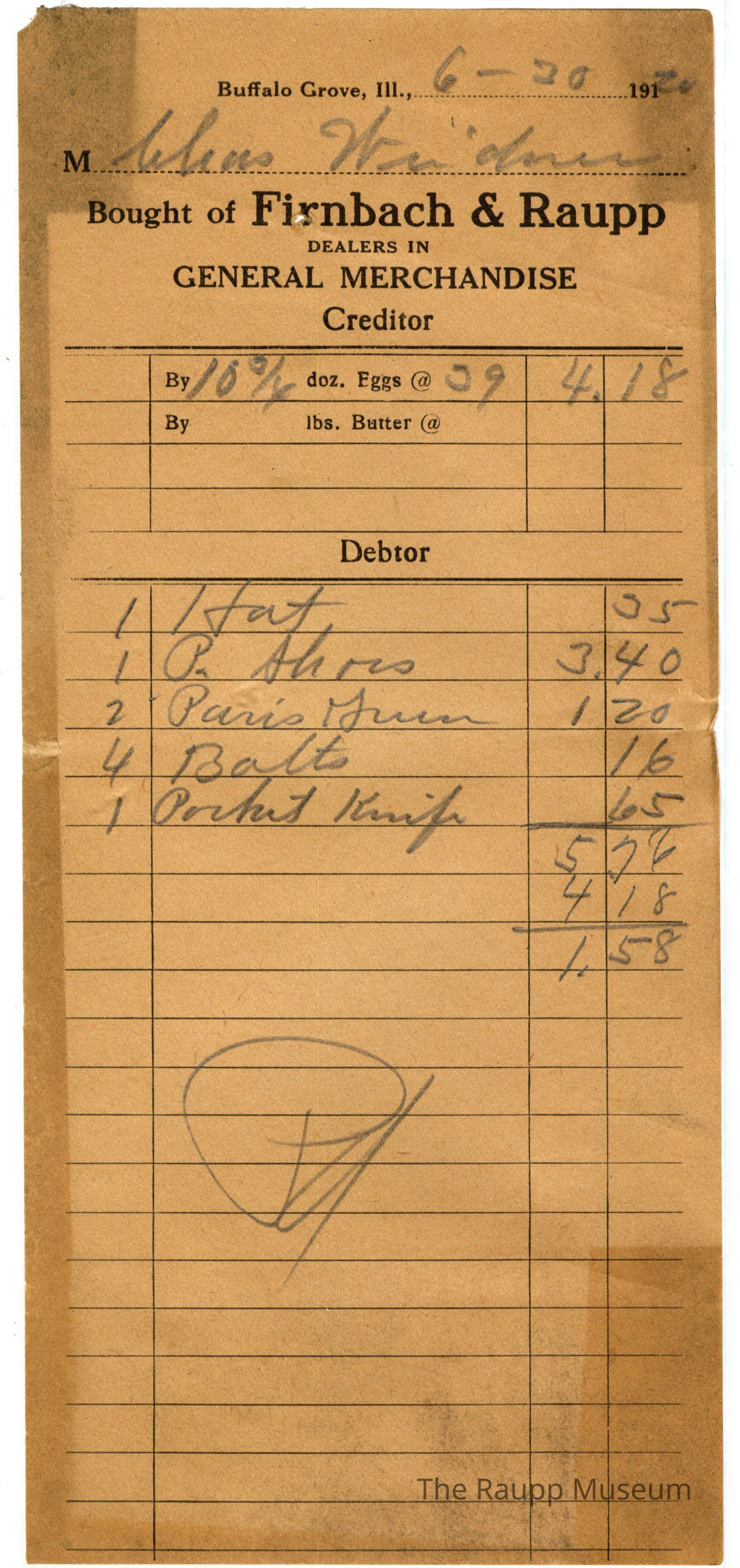 The black text is as follows, from top to bottom: Buffalo Grove, Ill., Bought of Firnbach & Raupp, Dealers in GENERAL MERCHANDISE; Creditor, By doz. Eggs @, By lbs. Butter @, DebtorArchive Details