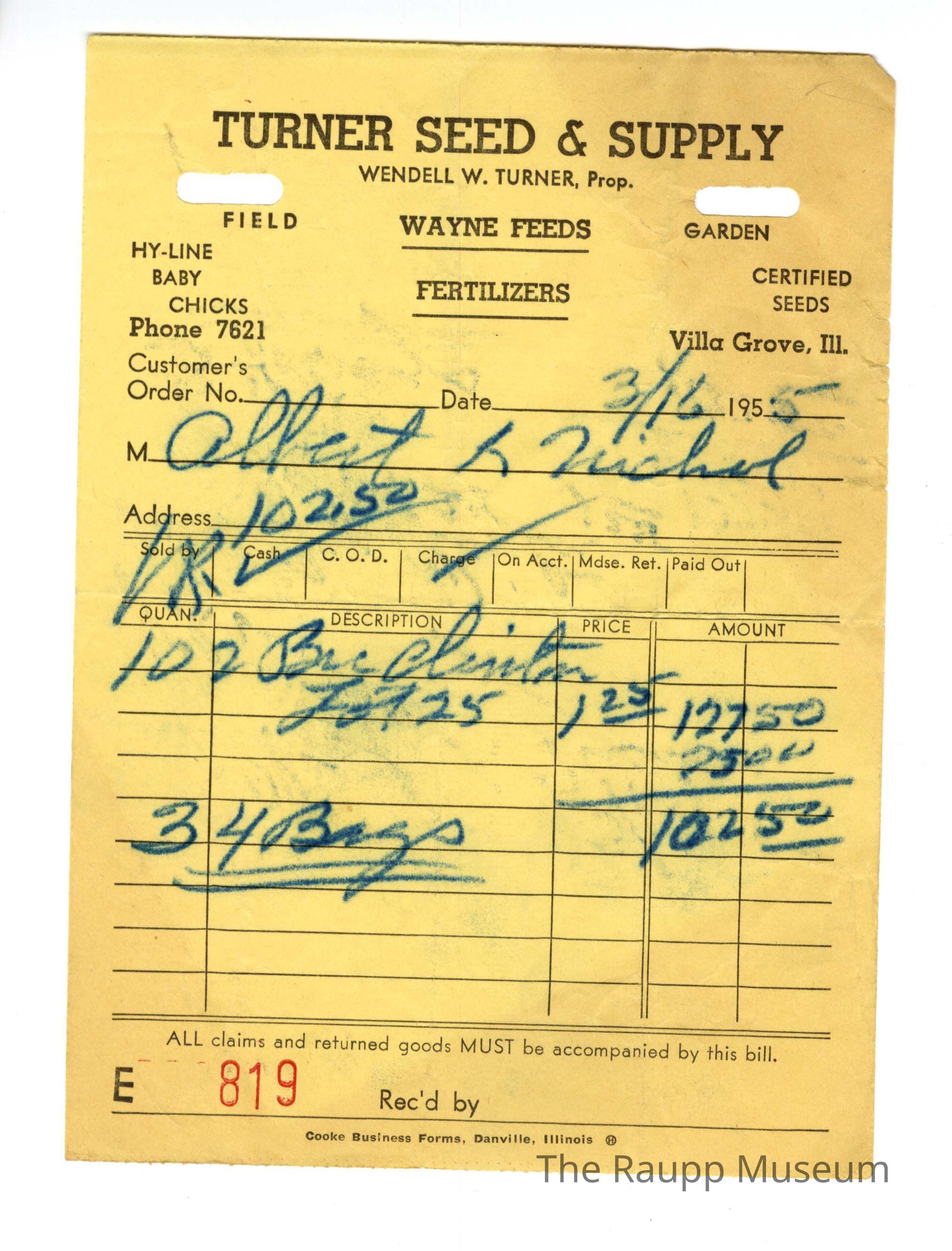 One (1) brown rectangular receipt from Turner Seed and Supply in Villa Grove, Illinois for Albert Nickol, dated 3/16/1955, Receipt is for Bre Clinton (?), 102 at $1.25 each for $127.50. There is a $25 subtraction and it states 34 bags $102.50 at bottom. Receipt has preprinted text and handwritten text in blue pen. There is a red "819" printed at the bottom.Archive Details