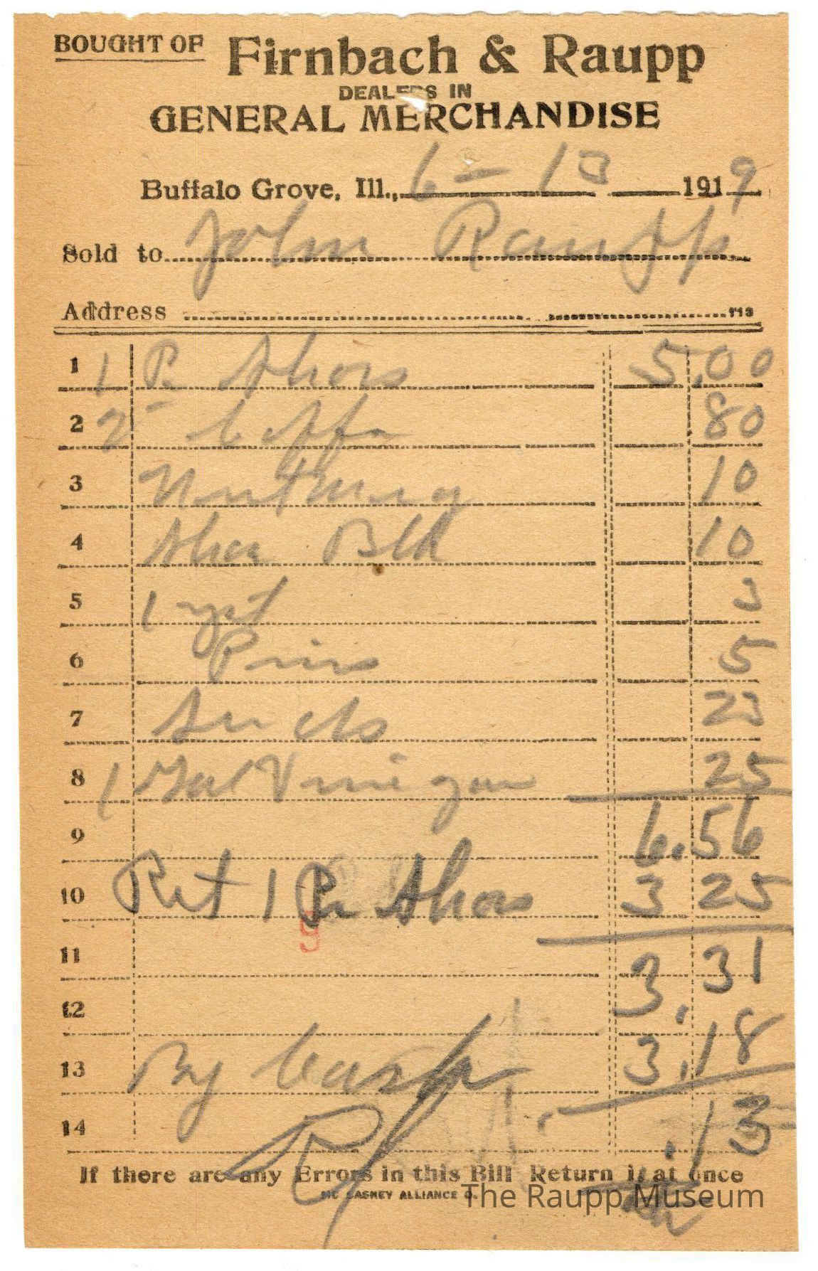 The black text is as follows, from top to bottom: Bought of Firnbach & Raupp, Dealers in GENERAL MERCHANDISE; Buffalo Grove Ill.; Sold to; Address; If there are any Errors in this Bill Return it at once; MC CASKEY ALLIANCE O.Archive Details