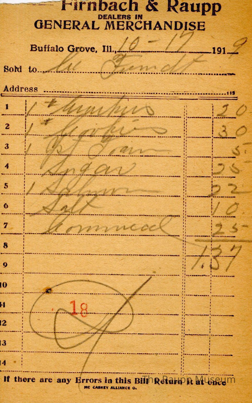 One (1) Firnbach and Raupp store receipt from October 17, 1919. Receipt is rectangular with black printed text and written notes in pencil. The receipt is for C. Fremdt (?), who bought one pound of crackers for $0.20, one pound of cookies for $0.30, one yeast foam for $0.05, sugar for $0.25, one salmon for $0.22, salt for $0.10, and cornmeal for $0.25. The total is $1.37. A red stamp of 18 is located towards the bottom of the page and the receipt is marked as paid. The text from top to bottom is: BOUGHT OF Firnbach & Raupp; DEALERS IN GENERAL MERCHANDISE; Buffalo Grove, Ill.; Sold to; Address; If there are any Errors in this Bill Return It at once; MC CASKEY ALLIANCE O.Archive Details