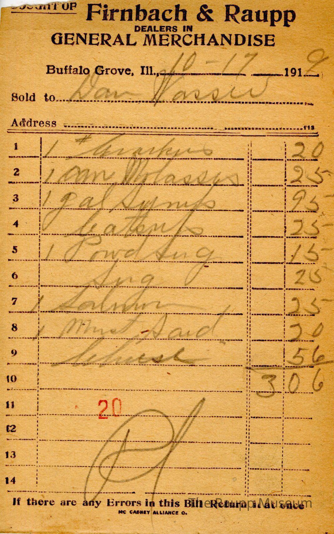 One (1) Firnbach and Raupp store receipt from October 17, 1919. Receipt is rectangular with black printed text and written notes in pencil. The receipt is for Dan Wasser, who bought one pound of crackers for $0.20, one can of molasses for $0.25, one gallon of syrup for $0.95, catsup (?) for $0.25, one powdered sugar for $0.15, sugar for $0.25, one salmon for $0.25, one Must Sard for $0.20, and cheese for $0.56. The total is $3.06. A red stamp of 20 is located towards the bottom of the page and the receipt is marked as paid. The text from top to bottom is: BOUGHT OF Firnbach & Raupp; DEALERS IN GENERAL MERCHANDISE; Buffalo Grove, Ill.; Sold to; Address; If there are any Errors in this Bill Return It at once; MC CASKEY ALLIANCE O.Archive Details