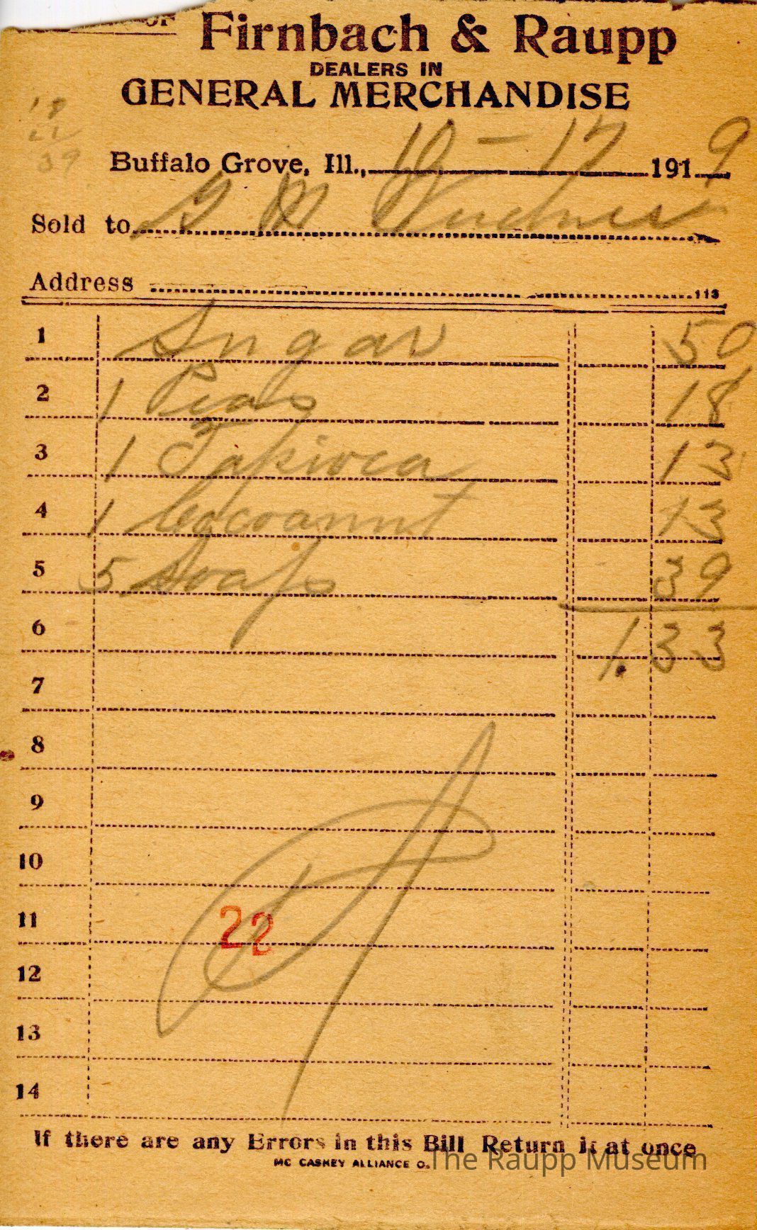 One (1) Firnbach and Raupp store receipt from October 17, 1919. Receipt is rectangular with black printed text and written notes in pencil. The receipt is for G. M. Weidner, who bought sugar for $0.50, one peas for $0.18, one tapioca for $0.13, one cocoanut for $0.13, and five soaps for $0.39. The total is $1.33. A red stamp of 22 is located towards the bottom of the page and the receipt is marked as paid. The text from top to bottom is: BOUGHT OF Firnbach & Raupp; DEALERS IN GENERAL MERCHANDISE; Buffalo Grove, Ill.; Sold to; Address; If there are any Errors in this Bill Return It at once; MC CASKEY ALLIANCE O.Archive Details