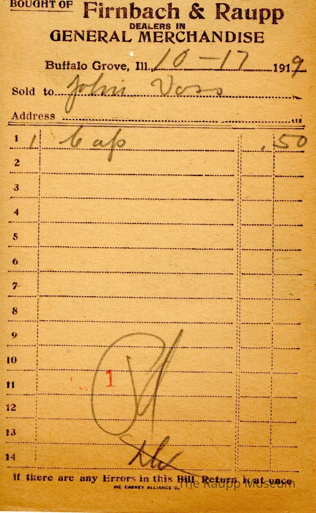 One (1) Firnbach and Raupp store receipt from October 17, 1919. Receipt is rectangular with black printed text and written notes in pencil. The receipt is for John Urso (?), who bought one cap for $0.50. The total is $0.50. A red stamp of 1 is located towards the bottom of the page and the receipt is marked as paid. The text from top to bottom is: BOUGHT OF Firnbach & Raupp; DEALERS IN GENERAL MERCHANDISE; Buffalo Grove, Ill.; Sold to; Address; If there are any Errors in this Bill Return It at once; MC CASKEY ALLIANCE O.Archive Details