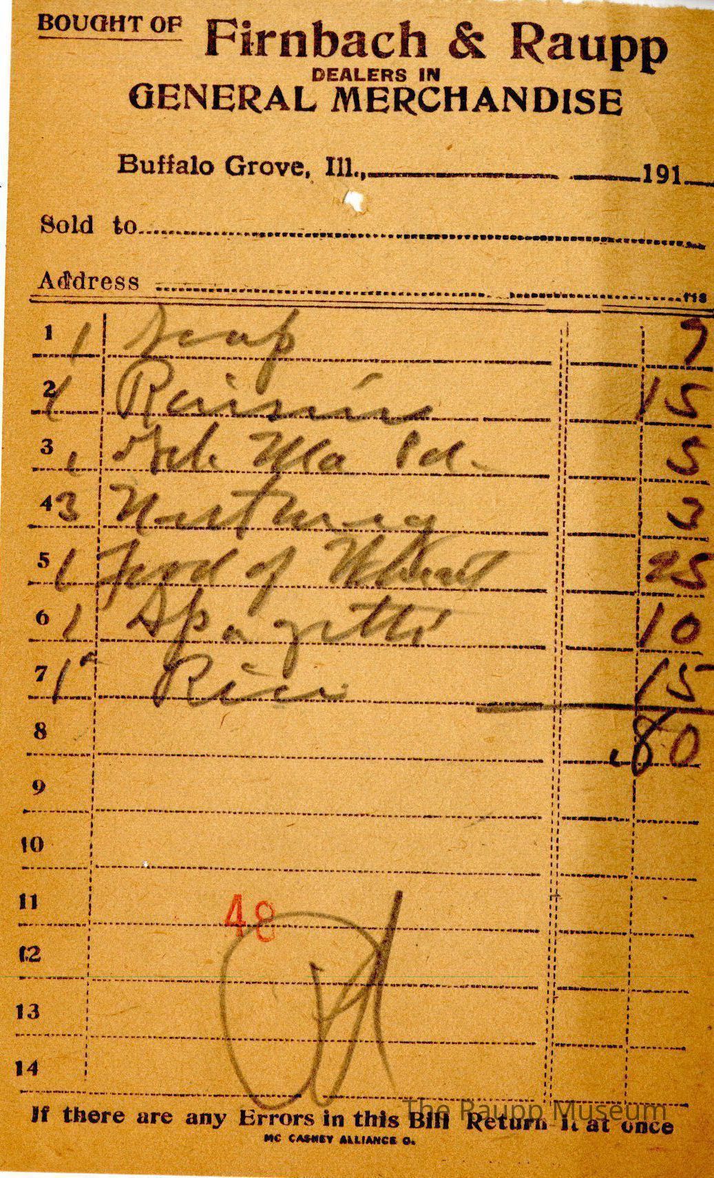 The black text is as follows, from top to bottom: "Bought of Firnbach & Raupp; DEALERS IN GENERAL MERCHANDISE; Buffalo Grove,Il; Sold to: Address; If there are any errors in this Bill Return it at once: MC Caskey Alliance O."Archive Details