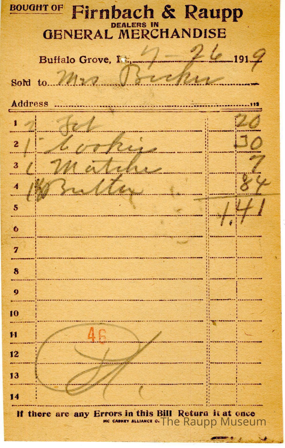 The receipt is for Mrs. Becker, who bought 2 tab for $0.20, 1# cookies for $0.30, 1 matches for $0.07 and 1#(?) butter for $0.84. The bill total was $1.41. The bill is marked as paid, and there is a red stamp of "46" at the bottom of the receipt.