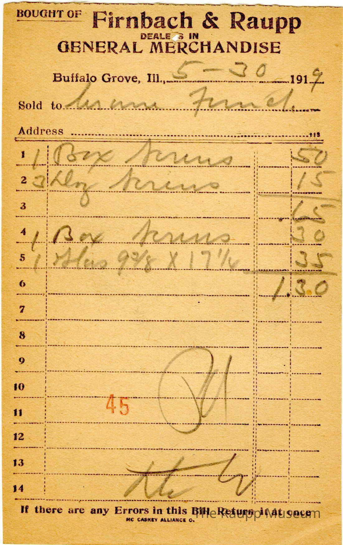 One (1) Firnbach and Raupp store receipt from May 30, 1919. Receipt is rectangular with black printed text and written notes in pencil. The receipt is for Crane Funnel(?), who bought one box screws for $0.50, three dz (dozen) screws for $0.15, one box screws for $0.30, and one glas(?) 9-3/8 x 17-1/4 for $0.35. The bill total is $1.30.