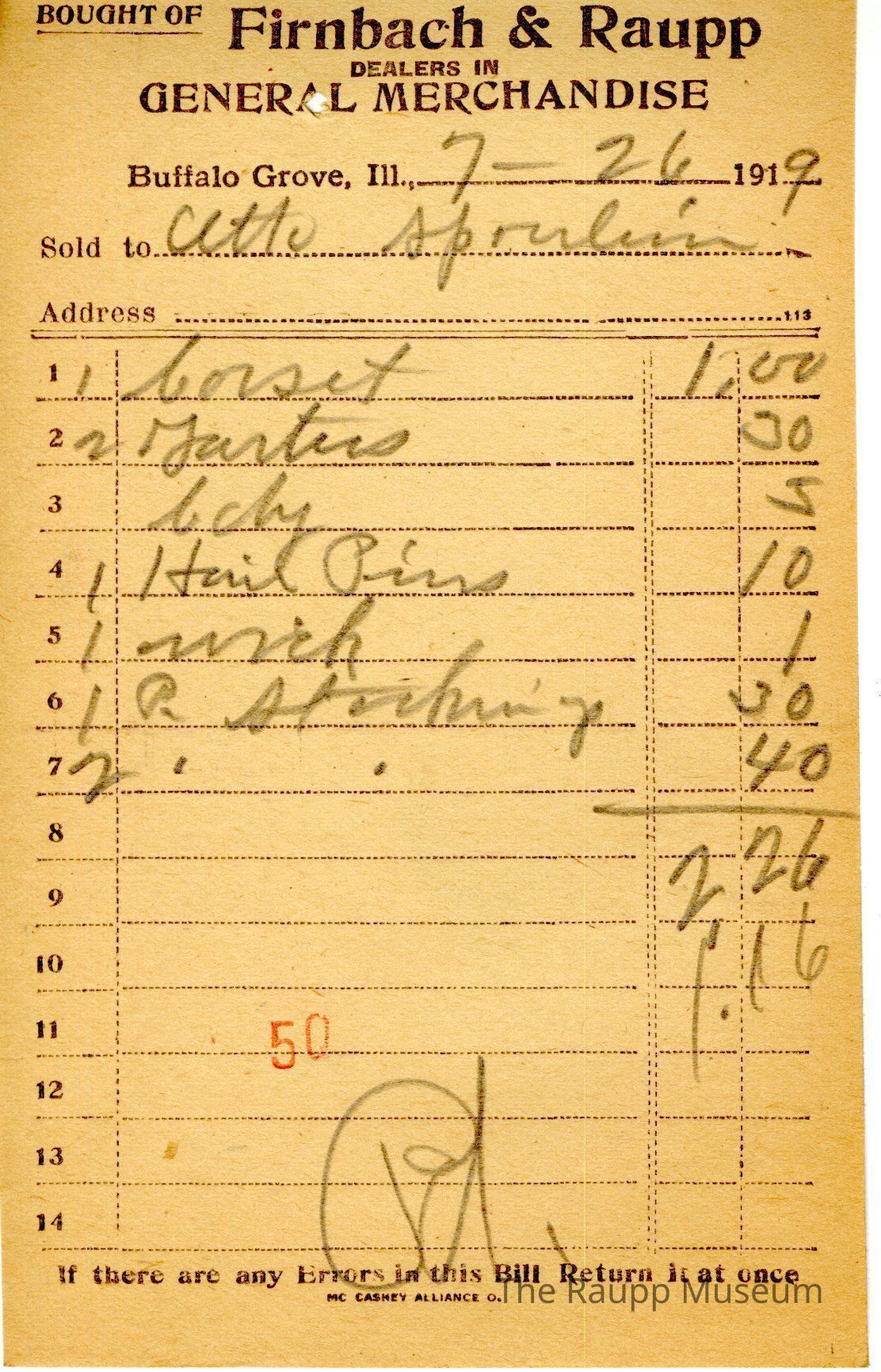 The black text is as follows, from top to bottom: Bought of Firnbach & Raupp; DEALERS IN; GENERAL MERCHANDISE; Buffalo Grove, Ill; Sold to; Address; If there are any Errors in this Bill, Return it at once; Mc Caskey Alliance CoArchive Details
